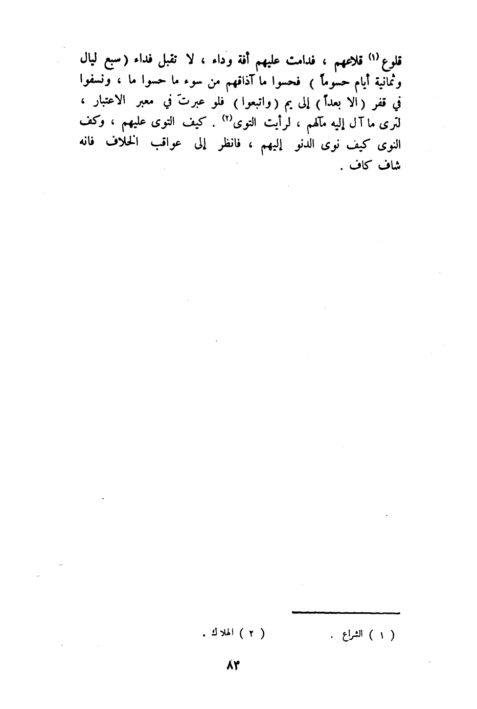 قلوع قلاعهم فدامت عَلَيْهِم أفة وداء لَا تقبل فدَاء {سبع لَيَال وَثَمَانِية أَيَّام حسوما} فحسوا مَا آذاقهم من سوء مَا حسوا ونسفوا فِي قفر {أَلا بعدا} إِلَى يم {وَاتبعُوا} فَلَو عبرت فِي معبر الِاعْتِبَار لترى مَا آل إِلَيْهِ مآلهم لرأيت التوى كَيفَ التوى عَلَيْهِم وكف النَّوَى كَيفَ نوى الدنو إِلَيْهِم فَانْظُر إِلَى عواقب الْخلاف فَإِنَّهُ شاف كَاف