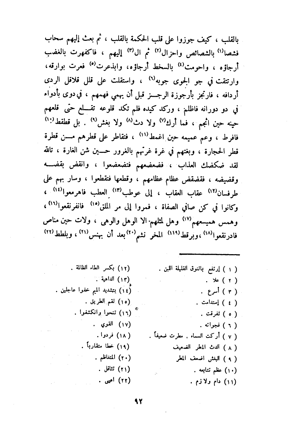 بِالْقَلْبِ كَيفَ جوزوا على قلب الْحِكْمَة بِالْقَلْبِ ثمَّ بعث إِلَيْهِم سَحَاب فشصا بالشصائص واحزال ثمَّ آل إِلَيْهِم فاكفهرت بِالْغَضَبِ أرجاؤه واحومت بالسخط أرجاؤه وابذعرت فعرت بوارقه وارتتقت فِي جو الجوى جوبه واستقلت على قلل قلاقل الردى أردافه فارتجز بأرجوزة الرجز قبل أَن يهمي فهمهم فِي دوى بأدواء فِي دو دورانه فاظلم وركد كَيده فَلم تكد قلوعه تقلع حَتَّى قلعهم حِينه حِين اثجم فَمَا أرك وَلَا دث وَلَا بغش بل قطقط فافرط وَعم عميمه حِين اغمط فتقاطر على قطرهم من قَطْرَة قطر الْحِجَارَة وبغتهم فِي غرَّة غرتهم بالغرور حِين شن الْغَارة تالله لقد ضكضك الْعَذَاب فضعضعهم فتضعضعوا وانقض بقضه وقضيضه فقضقض عِظَام عظامهم وقطعها فتقطعوا وَسَار بهم على طرفسان عِقَاب الْعقَاب إِلَى عوطب العطب فاهرمعوا وَكَانُوا فِي كن صافي الصفاة فَمروا إِلَى مر الملق فانفرنقعوا وهمس هميسعهم وَهل لمثلهم إِلَّا الوهل والوهى ولات حِين مناص فادرنقعوا وبرقط المخر نَشُمُّ بعد أَن بهنس وبلطط
