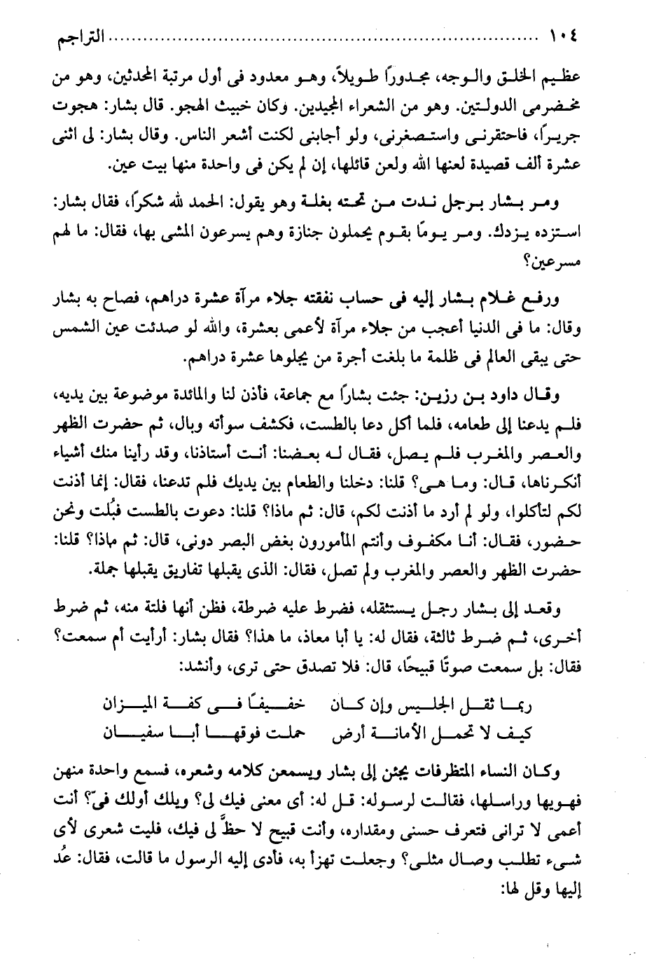 وقال داود بن رزين: جئت بشارا مع جماعة. فأذن لنا والمائدة موضوعة بين يديه، فلم يدعنا إلى طعامه. فلما أكل دعا بالطست، فكشف سوأته وبال. ثم حضرت الظهر والعصر والمغرب، فلم يصل. فقال له بعضنا: أنت أستاذنا. وقد رأينا منك أشياء أنكرناها. قال: وماهي؟ قلنا: دخلنا والطعام بين يديك فلم تدعنا. فقال إنما أذنت لكم لتأكلوا. ولو لم أرد، ما أذنت لكم. قال: ثم ماذا؟ قلنا: دعوت بالطست فبلت، ونحن حضور. فقال: أنا مكفوف وأنتم المأمورون بغض البصر دوني. قال: ثم ماذا؟ قلنا: حضرت الظهر والعصر والمغرب، ولم تصل. فقال: الذي يقبلها تفاريق يقبلها جملة.