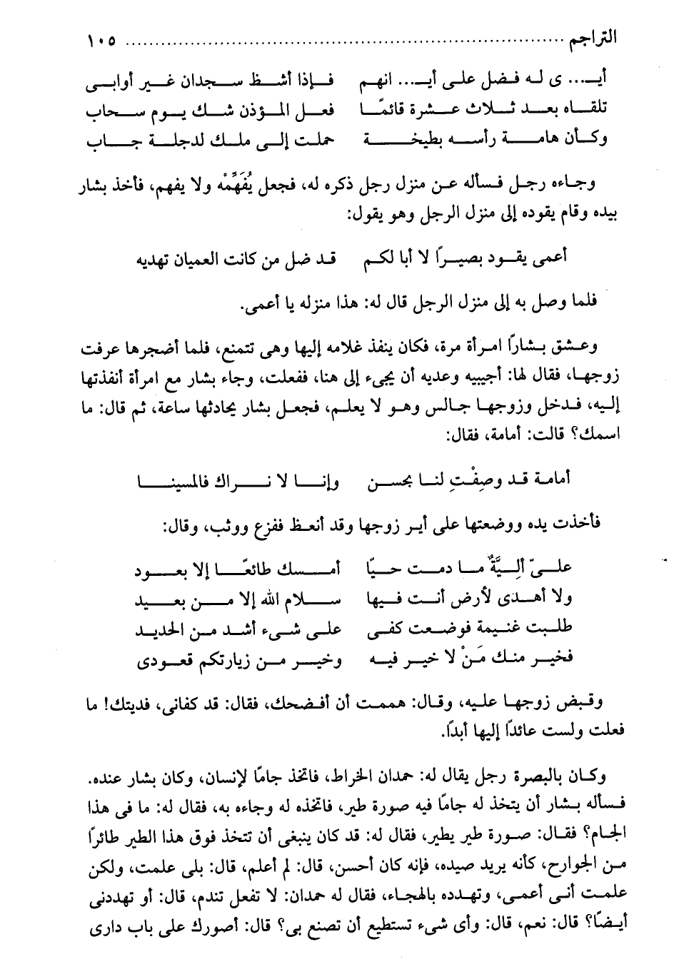 وجاءه رجل، فسأله عن منزل رجل ذكره له. فجعل يفهمه ولا يفهم. فأخذ بشار بيده وقام يقوده إلى منزل الرجل، وهو يقول: