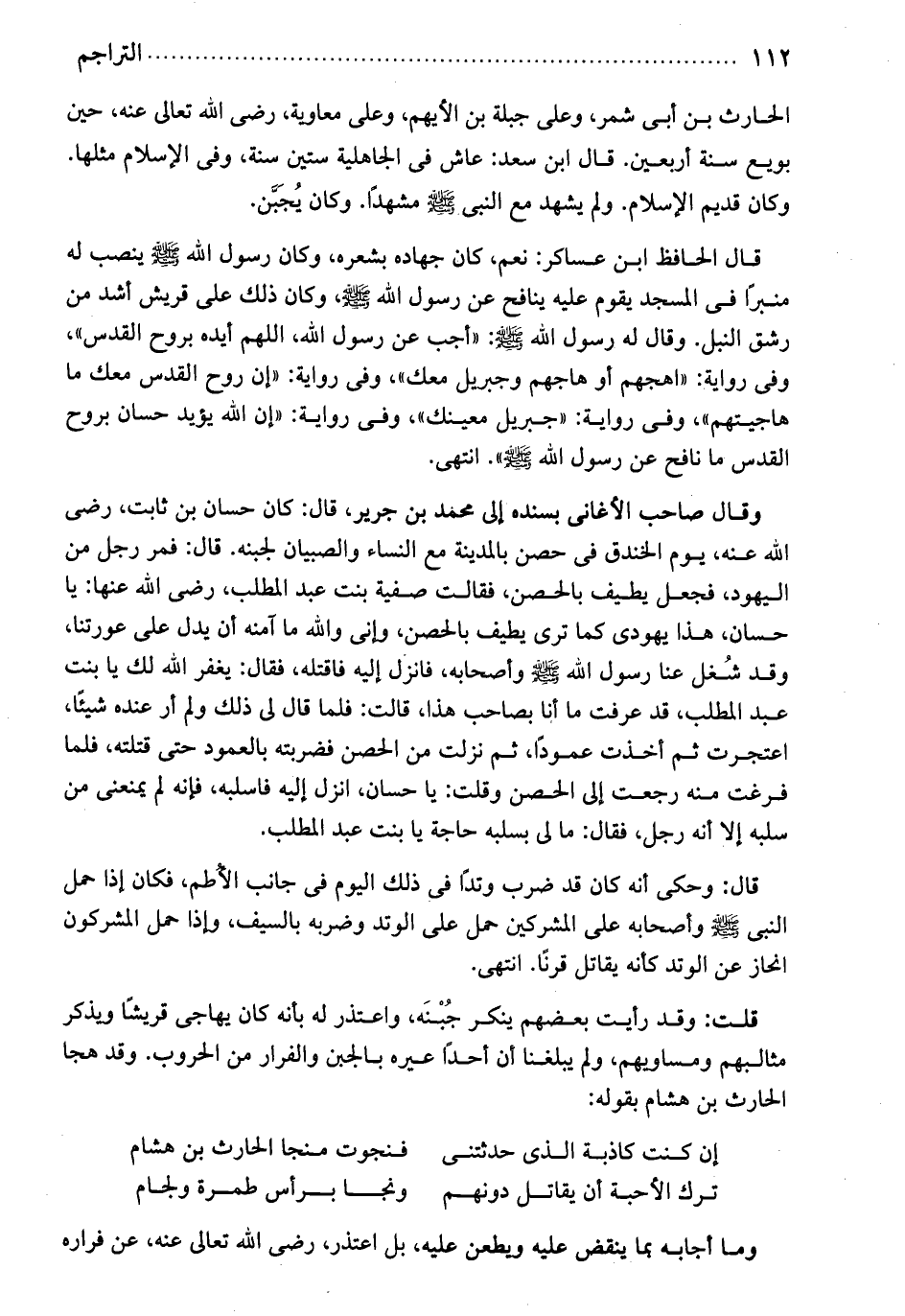 وقال صاحب الأغاني بسنده إلى محمد بن جرير قال: كان حسان بن ثابت رضي الله عنه يوم الخندق في حصن بالمدينة مع النساء والصبيان لجبنه. قال: فمر رجل من اليهود، فجعل يطيف بالحصن فقالت حفية بنت عبد المطلب رضي الله عنها يا حسان هذا يهودي كما ترى يطيف بالحصين. وإني والله ما آمنه أن يدل على عورتنا. وقد شغل عنا رسول الله صلى الله عليه وسلم وأصحابه. فانزل إليه فاقتله. فقال يغفر الله لك يا بنت عبد المطلب! قد عرفت ما أنا بصاحب هذا. قالت: فلما قال لي ذلك ولم أر عنده شيئاً، اعتجرت ثم أخذت عموداً ثم نزلت من الحصن فضربته بالعمود حتى قتلته. فلما فرغت منه رجعت إلى الحصن وقلت: يا حسان أنزل إليه فاسلبه، فإنه لم يمنعني من سلبه إلا أنه رجل. فقال ما لي بسلبه حاجة! يا بنت عبد المطلب.