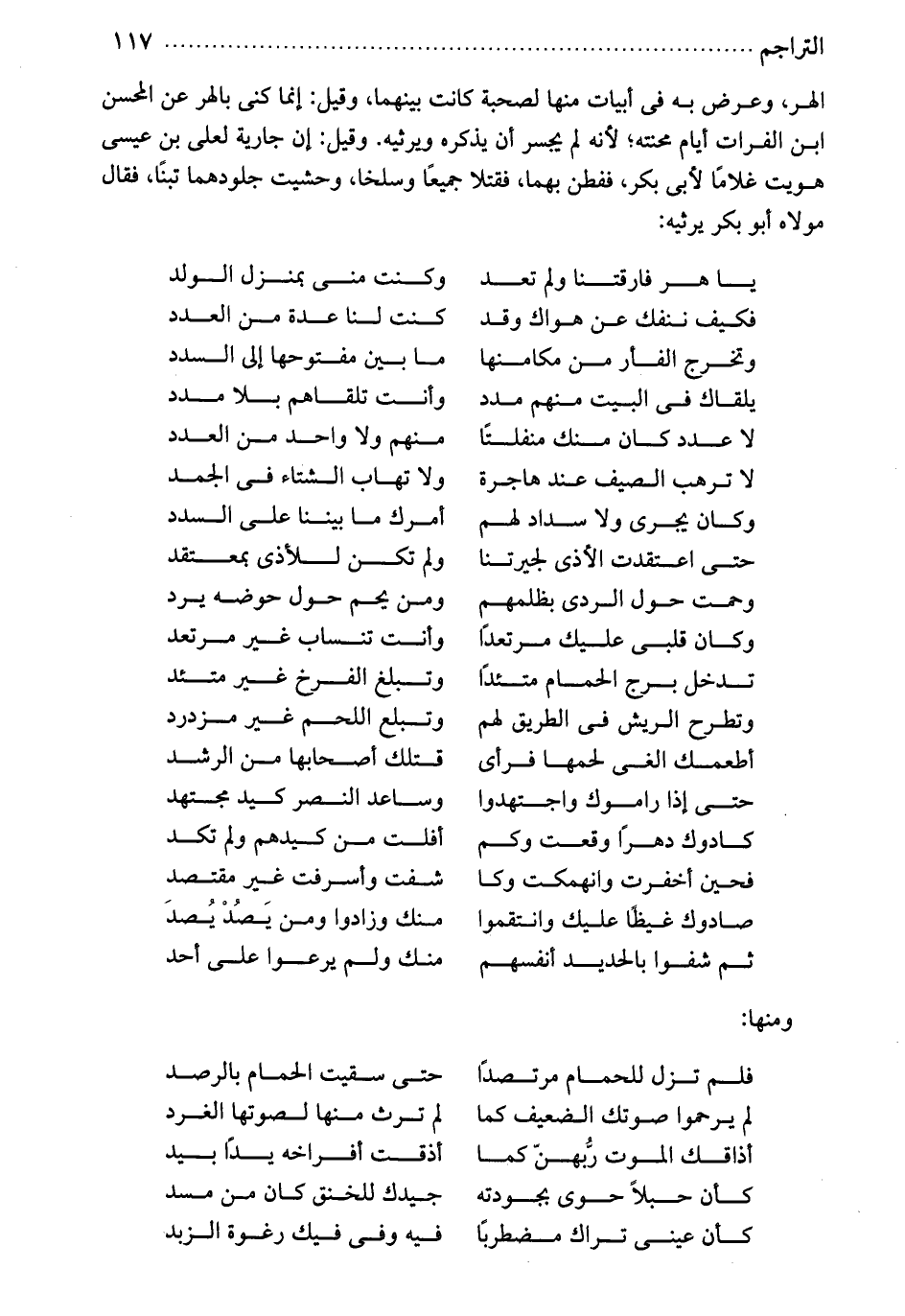 الهر، وعرض به في أبيات منها لصحبة كانت بينهما، وقيل إنما كنى بالهرعن المحسن ابن الفرات. أيام محنته، لأنه لم يجسر أن يذكره ويرثيه. وقيل إن جارية لعلي بن عيسى هويت غلاماً لأبي بكر ففطن بهما. فقتلا جميعاً، وسلخا وحشيت جلودهما تبناً. فقال مولاه أبو بكر يرثيه: