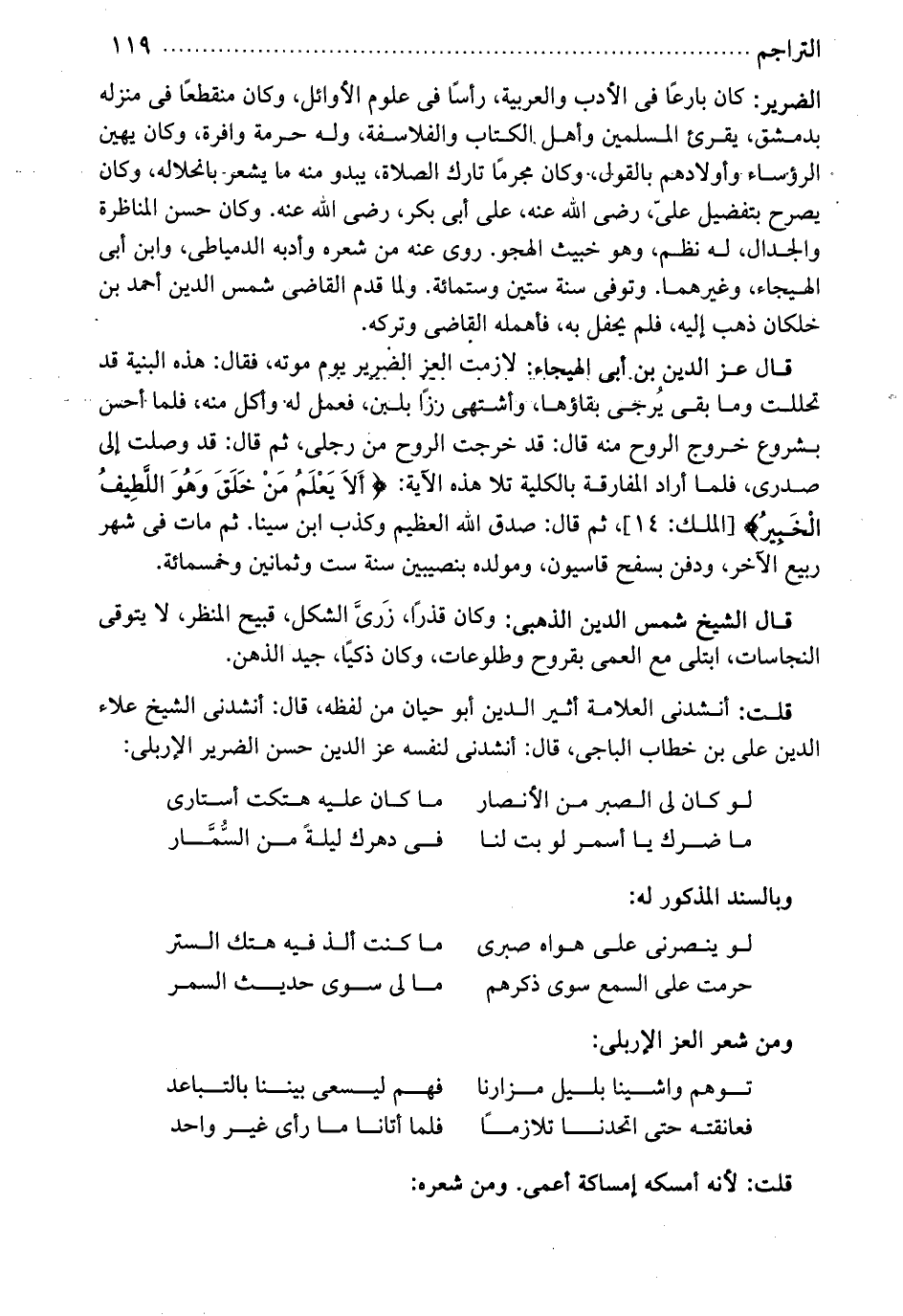 الضرير. كان بارعاً في الأدب والعربية. رأساً في علوم الأوائل. وكان منقطعاً في منزله بدمشق. يقرئ المسلمين وأهل الكتاب والفلاسفة. وله حرمة وافرة. وكان يهين الرؤساء وأولادهم بالقول. وكان مجرماً تارك الصلاة، يبدوا منه ما يشعر بانحلاله. وكان يصرح بتفضيل علي ري الله عنه، على أبي بكر رضي الله عنه. وكان حسن المناظرة والجدال. له نظم، وهو خبيث الهجو. روى عنه من شعره وأدبه الدمياطي، وابن أبي الهيجاء، وغيرهما. توفي سنة ستين وستمائة. ولما قدم القاضي شمس الدين احمد بن خلكان، ذهب إليعه فلم يحفل به، فأهمله القاضي وتركه. قال عز الدين ابن أبي الهيجاء: لازمت العز الضرير يوم موته، فقال: هذه البنية قد تحللت، وما بقي يرجى بقاؤها، وأشتهي رزاً بلبن، فعمل له وأكل منه. فلما أحس بشروع خروج الروح منه. قال: قد خرجت الروح من رجلي، ثم قال: قد وصلت إلى صدري. فلما أراد المفارقة بالكلية تلا هذه الآية " ألا يعلم من خلق وهو اللطيف الخبير. " ثم قال: صدق الله العظيم، وكذب ابن سينا. ثم مات في شهر ربيع الآخر. ودفن بسفح قاسيون. ومولده بنصيبين، سنة ست وثمانين وخمسمائة. قال الشيخ شمس الدين الذهبي: وكان قذراً، زرى الشكل، قبيح المنظر، لا يتوقى النجاسات، ابتلى مع العمى بقروح وطلوعات. وكان ذكياً. جيد الذهن. قلت: أنشدني العلامة أثير الدين أبو حيان من لفظه، قال أنشدني الشيخ علاء الدين علي بن خطاب الباجي، قال: أنشدني لنفسه عز الدين حسن الضرير الإربلي.