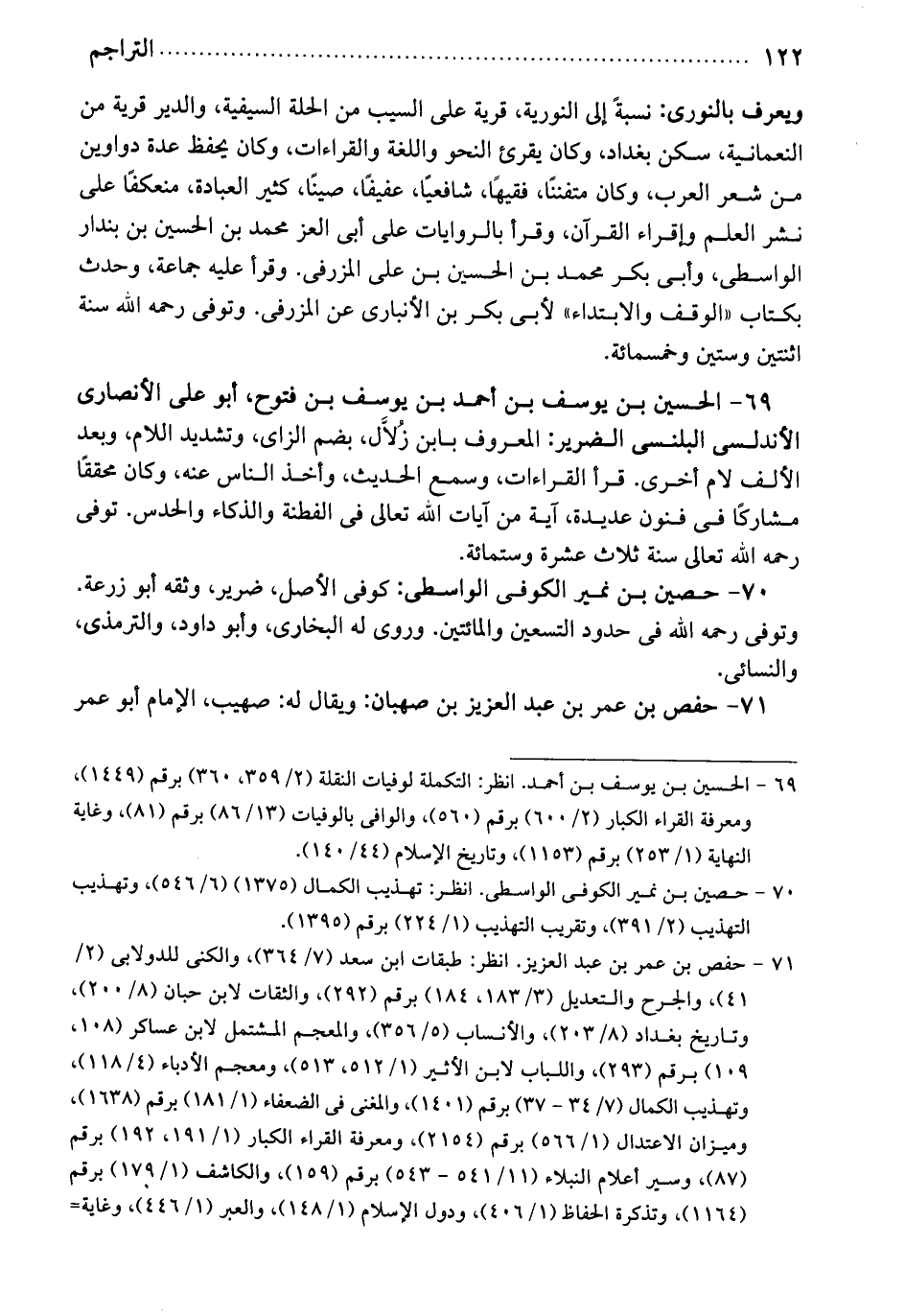 حصين بن نمير: الكوفي الواسطي. كوفي الأصل ضرير. وثقة أبو زرعة. وتوفي رحمه الله في حدود التسعين والمائتين. وروى له البخاري وأبو داود، والترمذي، والنسائي.