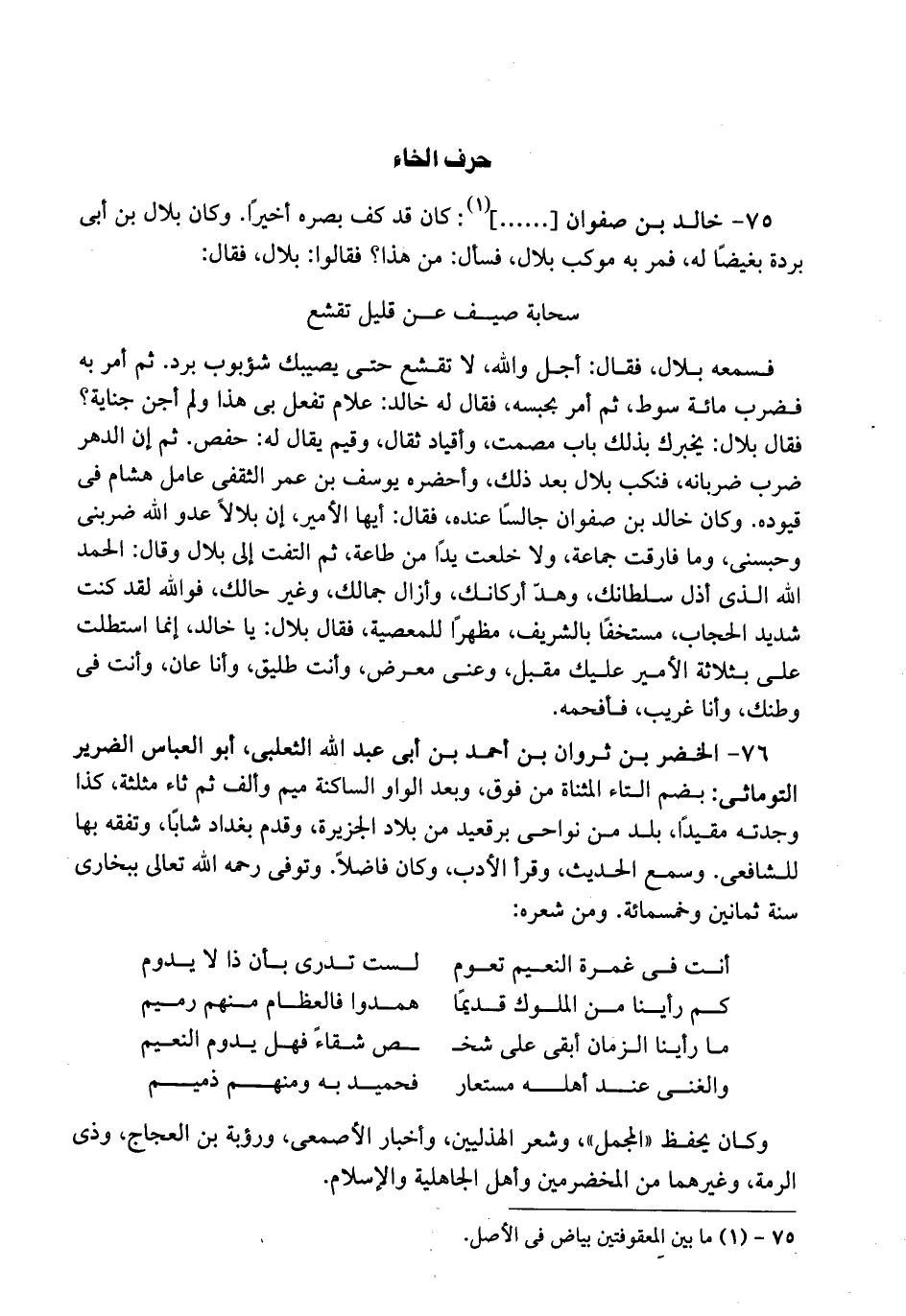 فسمعه بلال، فقال: أجل والله! لا تقشع حتى يصيبك شؤبوب برد. ثم أمر به فضرب مائة سوط، ثم أمر بحبسه. فقال له خالد: علام تفعل بي هذا ولم أجن جناية. فقال بلال: يخبرك بذلك باب مصمت، وأقياد ثقال، وقيم يقال له حفص. ثم إن الدهر ضرب ضربانه، فنكب بلال بعد ذلك، وأحضره يوسف بن عمر الثقفي عامل هشام في قيوده. وكان خالد بن صفوان جالساً عنده. فقال: أيها الأمير، إن بلالاً عدو الله ضربني وحبسني، وما فارقت جماعة، ولا خلعت يداً من طاعة. ثم التفت إلى بلال. وقال: الحمد الله الذي أذل سلطانك، وهد أركانك، وأزال جمالك، وغير حالك. فوالله كنت شديد الحجاب، مستخفاً بالشريف، مظهراً للمعصية، فقال بلال: يا خالد! إنما استطلت علي بثلاثة، الأمير عليك مقبل، وعني معرض. وأنت طليق، وأنا عان. وأنت في وطنك، وأنا غريب. فأفحمه.