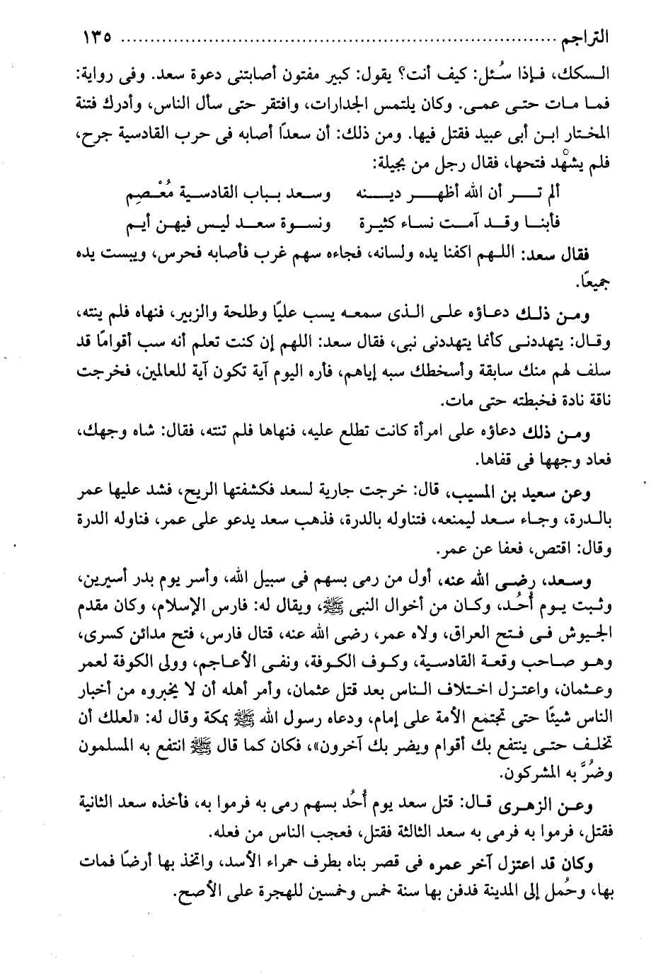 وسعد رضي الله عنه. أول من رمى بسهم في سبيل الله. واسر يوم بدر اسيرين. وثبت يوم أحد. وكان من أخوال النبي صلى الله عليه وسلم. ويقال له فارس الإسلام. وكان مقدم الجيوش في فتح العراق. ولاه عمر رضي الله عنه قتال فارس، فتح مدائن كسرى. وهو صاحب وقعة القادسية. وكوف الكوفة ونفى الأعاجم. وولى الكوفة لعمر وعثمان. واعتزل اختلاف الناس بعد قتل عثمان. وأمر أهله أن لا يخبروه من أخبار الناس شيئاً، حتى تجتمع الأمة على إمام. ودعاه رسول الله صلى الله عليه وسلم بمكة وقال له: لعلك أن تخلف حتى ينتفع بك أقوام ويضر بك آخرون. فكان كما قال صلى اله عليه وسلم انتفع به المسلمون، وضربه المشركون. وعن الزهري قال: قتل سعد يوم أحد بسهم رمى به فرموا به فأخذه سعد الثانية فقتل فرموا به فرمى به سعد الثالثة فقتل. فعجب الناس من فعله. وكان قد اعتزل آخر عمره في قصر بناه بطرف حمراء الأسد، واتخذ بها أرضاً فمات بها وحمل إلى المدينة، فدفن بها سنة خمس وخمسين للهجرة، على الأصح.