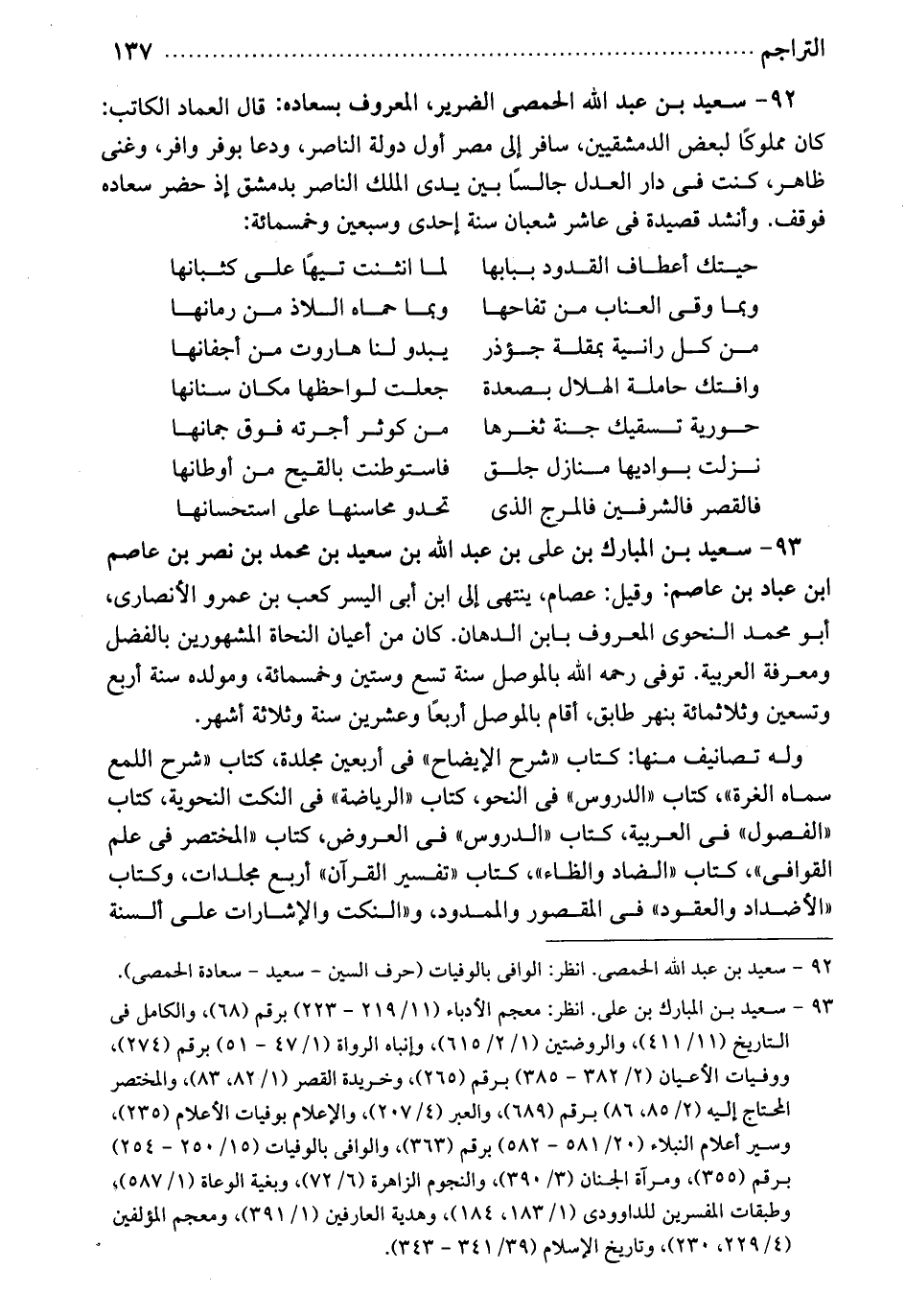 الحمصي الضرير. المعروف بسعاده. قال العماد الكاتب: كان مملو كالبعض الدمشقيين. سافر إلى مصر أول دولة الناصر، ودعا بوفر وافر، وغنىً ظاهر، كنت في دار العدل جالساً بين يدي الملك الناصر بدمشق إذ حضر سعاده، فوقف. وأنشد قصيدة في عاشر شعبان سنة إحدى وسبعين وخمسمائة: