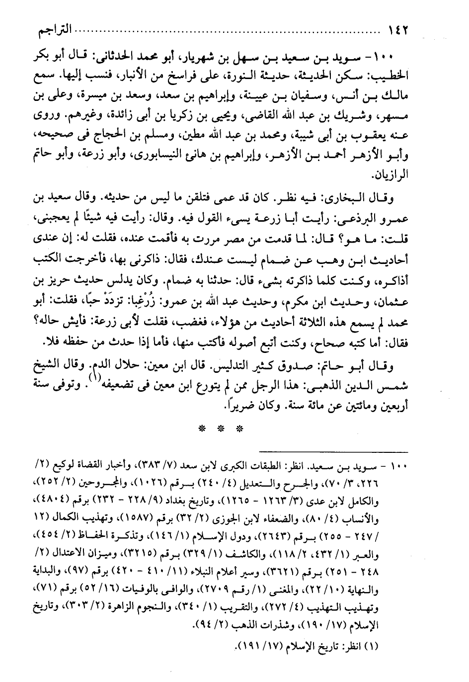 سويد بن سعيد: ين سهل بن شهريار. أبو محمد الحد ثاني. قال أبو بكر الخطيب: سكن الحديثة، حديثة النورة على فراسخ من الأنبار، فنسب إليها. سمع مالك بن أنس وسفيان بن عيينة، وإبراهيم بن سعد، وسعد بن ميسرة، وعلي بن مسهر، وشريك بن عبد الله القاضي، ويحيى بن زكريا بن أبي زائدة، وغيرهم. وروى عنه يعقوب ابن أبي شيبة ومحمد بن عبد الله مطين، ومسلم بن الحجاج، في صحيحه وأبو الأزهر أحمد ابن الأزهر، وإبراهيم بنهانئ النيسابوري، وأبو زرعة، وأبو حاتم الرازيان. وقال البخاري: فيه نظر. كان قد عمى فتلقن ما ليس من حديثه. وقال سعيد بن عمرو البرذعي: رأيت أبا زرعة يسيء القول فيه. وقال: رأيت فيه شيئاً لم يعجبني. قلت: ما هو؟ قال: لما قدمت من مصر مررت به فأقمت عنده. فقلت له: إن عندي أحاديث ابن وهب عن ضمام ليست عندك. فقال: ذاكرني بها. فأخرجت الكتب أذاكره. وكنت كلما ذاكرته بشيء قال حدثنا به ضمام. وكان يدلس حديث بن عثمان، وحديث ابن مكرك، وحديث عبد الله بن عمرو زرغبا: تزدد حباً. فقلت أبو محمد لم يسمع هذه الثلاثى أحاديث من هؤلاء. فغضب. فقلت لأبي زرعة: فأيش حاله؟ فقال: أما كتبه صحاح. وكنت أتبع أصوله فأكتب منها. فاما إذا حدث من حفظه، فلا. وقال أبو حاتم: صدوق كثير التدليس. قال ابن معين: حلال الدم.