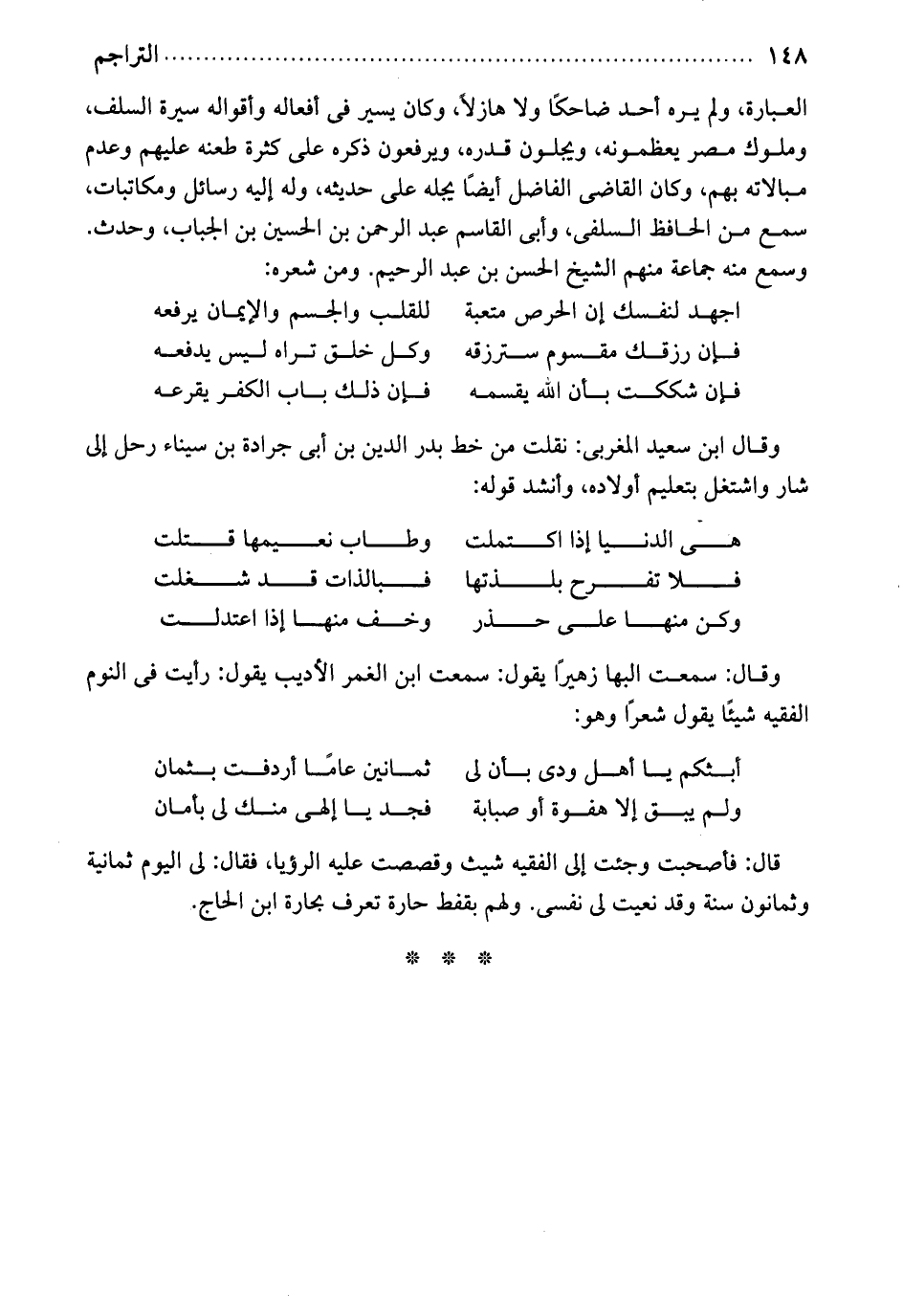 وقال سمعت إليها زهيراً يقول: سمعت ابن الغمر الأديب يقول، رأيت في النوم الفقيه شيئاً يقول، شعراً وهو: