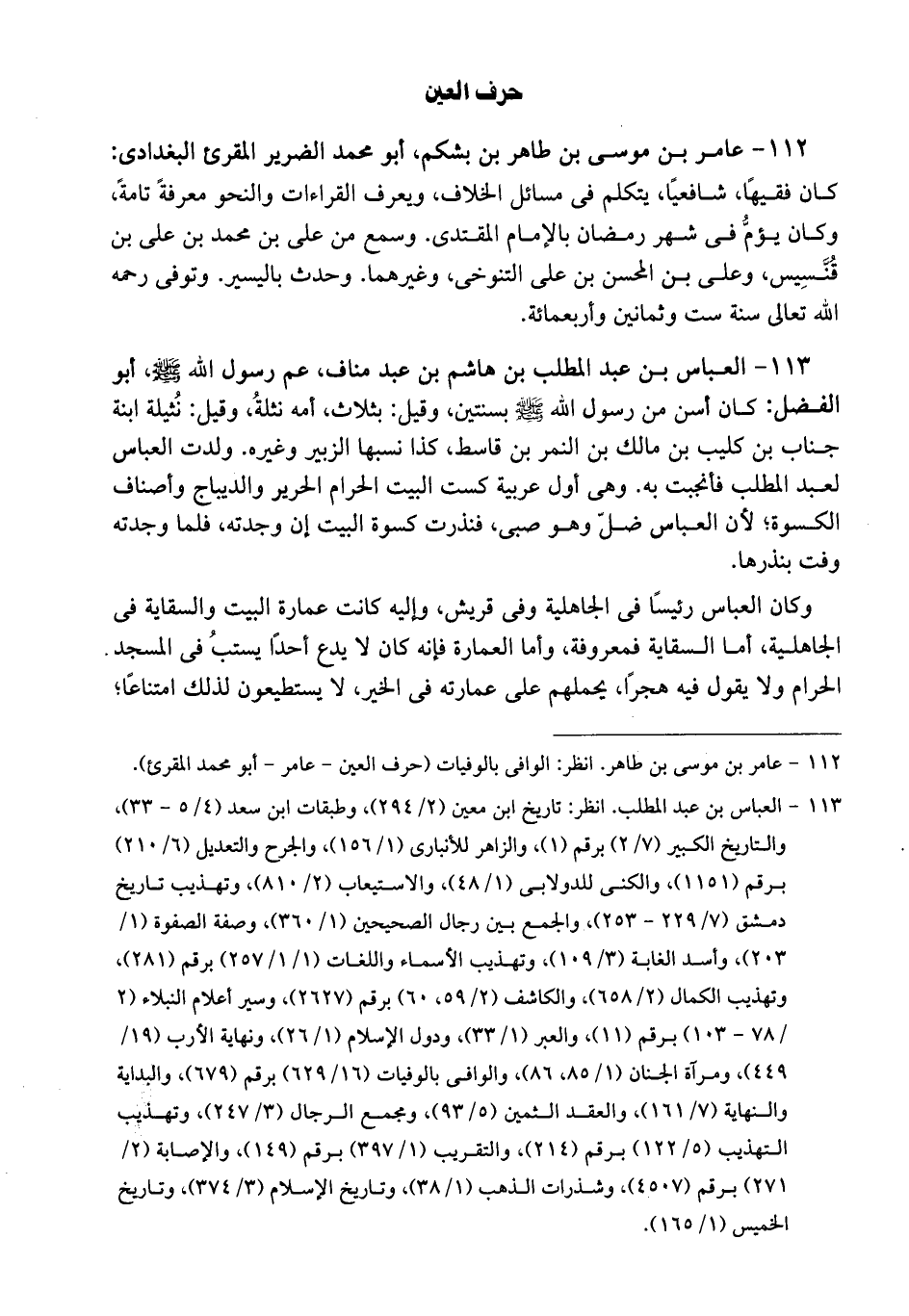 بن هاشم بن عبد مناف، عم رسول الله صلى الله عليه وسلم، أبو الفضل. كان أسن من رسول الله صلى الله عليه وسلم بسنتين، وقيل بثلاث، أمه نثلة، وقيل نثيلة ابنة جناب بن كليب بن مالك بن النمر بن قاسط. كذا نسبها الزبير وغيره. ولدت العباس لعبد المطلب، فأنجبت به. وهي أول عربية كست البيت الحرام الحرير والديباج وأصناف الكسوة. لأن العباس ضل وهو صبي فنذرت كسوة البيت إن وجدته. فلما وجدته، وفت بنذرها. وكان العباس رئيساً في الجاهلية وفي قريش وإليه كانت عمارة البيت والسقاية في الجاهلية، أما السقاية. فمعروفة وأما العمارة، فإنه كان لا يدع أحداً يسقب في المسجد الحرام ولا يقول فيه هجراً: يحملهم على عمارته في الخير، لا يستطيعون لذلك امتناعاً،
