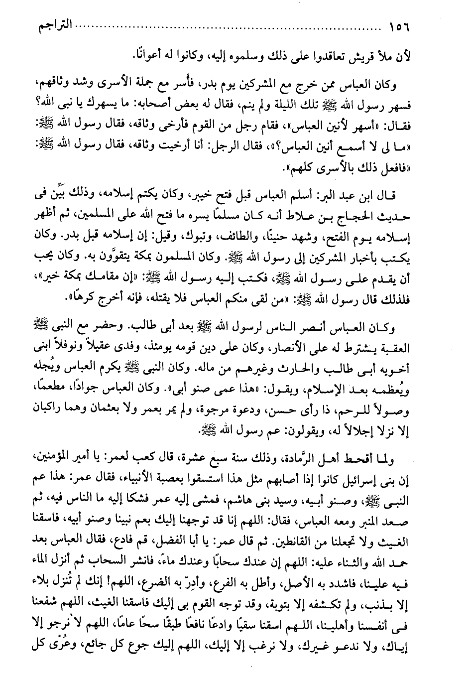 لان ملا قريش تعاقدوا على ذلك وسلموه إليه، وكانوا له أعواناً. وكان العباس ممن خرج مع المشركين. يوم بدر فأسر مع جملة الأسرى وشد وثاقهم. فسهر رسول الله صلى الله عليه وسلم تلك الليلة ولم ينم. فقال له بعض أصحابه: ما يسهرك يا نبي الله فقال: أسهر لأنين العباس. فقام رجل من القوم فأرخى وثاقه. فقال رسول الله صلى الله عليه وسلم: فافعل ذلك بالأسرى كلهم.