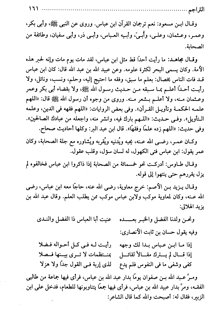 وقال ابن مسعود: نعم ترجمان القرآن ابن عباس. وروى عن النبي صلى الله عليه وسلم، وأبي بكر، وعمر، وعثمان، وعلي، وأبي، وأبيه العباس، وبأبي ذر، وأبي سفيان، وطائفة من الصحابة. وقال مجاهد: ما رأيت أحداً قط مثل ابن عباس. لقد مات يوم مات وإنه لحبر هذه الأمة. وكان يسمى البحر لكثرة علومه. وعن عبيد الله بن عبد الله، قال: كان ابن عباس قد فات الناس بخصال: بعلم ما سبق، وفقه ما احتيج إليه، وحلم ونسب ونائل. ولا رأيت أحداً أعلم بما سبقه من حديث رسول الله صلى الله عليه وسلم ولا بقضاء أبي بكر وعمر وعثمان منه، ولا أعلم بشعر منه. وروى من وجوه أن رسول الله صلى الله عليه وسلم قال: اللهم علمه الحكمة، وتأويل القرآن. وفي بعض الروايات: اللهم فقهه في الدين، وعلمه التأويل. وفي حديث: اللهم بارك فيه وانشر منه واجعله من عبادك الصالحين. وفي حديث: اللهم زده علماً وفقهاً. قال ابن عبد البر: وكلها أحاديث صحاح.