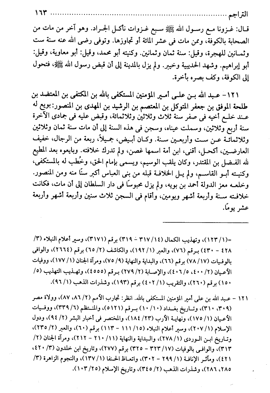 أمير المؤمنين المستكفي بالله. بن المكتفي بن المعتضد بن طلحة الموفق بن جعفر المتوكل بن المعتصم بن الرشيد بن المهدي بن المنصور. بويع له عند خلع أخيه، في صفر سنة ثلاث وثلاثين وثلاثمائة. وقبض عليه في جمادى الآخرة سنة أربع وثلاثين، وسملت عيناه، وسجن في هذه السنة إلى أن مات، سنة ثمان وثلاثين وثلاثمائة، عن ست وأربعين سنة. وكان أبيض جميلاً، ربعة من الرجال، خفيف العارضين، اكحل أقنى، ابن أمة اسمها غصن، ولم تدرك خلافته. وبايعوه بعد المطيع لله الفضل بن المقتدر. وكان يلقب الوسيم، ويسمى بإمام الحق، وخطب له بالمستكفي. وكنيته أبو القاسم. ولم يل الخلافة قبله من بني العباس أكبر سناً منه ومن المنصور. وخلعه معز الدولة أحمد بن بويه، ولم يزل محبوساً في دار السلطان إلى أن مات. فكانت خلافته سنة وأربعة أشهر ويومين. وأقام في السجن ثلاث سنين وأربعة اشهر وأربعة عشر يوماً.