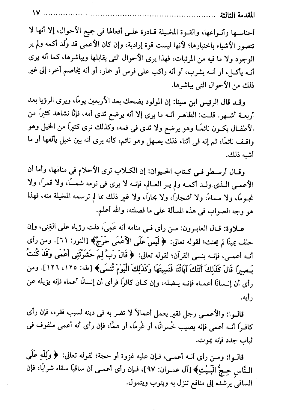 أجناسها وأنواعها. والقوة المخيلة قادرة على أفعالها في جميع الأحوال، إلا أنها لا تتصور الأشياء باختيارها، لأنها ليست قوة إرادية. وإن كان الأعمى قد ولد أكمة ولم ير الوجود ولا ما فيه من المرئيات فهذا يرى الأحوال التي يقابلها ويباشرها. كما أنه يرى أنه يأكل أو أنه يشرب أو أنه راكب على فرس أو حمار أو أنه يخاصم آخر، إلى غير ذلك من الأحوال التي يباشرها. وقد قال الرئيس ابن سينا: إن المولود يضحك بعد الأربعين يوماً، ويرى الرؤيا بعد أربعة اشهر.