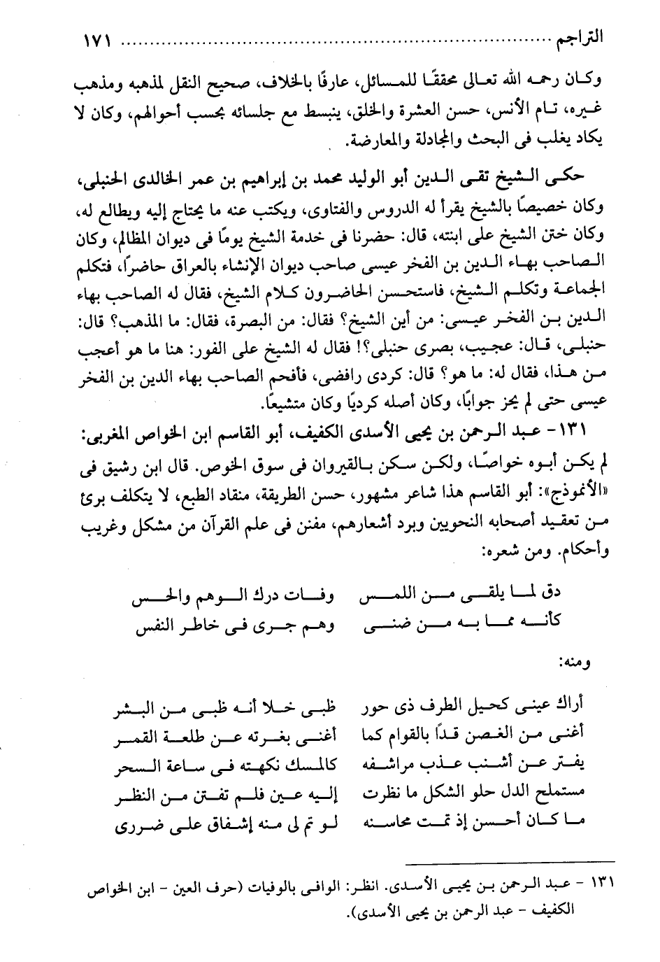 الأسدي الكفيف أبو القاسم. ابن الخواص المغربي. لم يكن أبوه خواصاً، ولكن سكن بالقيروان في سوق الخوص. قال بان رشيق في الأنموذج: أبو القاسم هذا شاعر مشهور، حسن الطريقة منقاد الطبع، لا يتكلف برئ من تعقيد أصحابه النحويين وبرد أشعارهم، مفنن في علم القرآن من مشكل وغريب وأحكام. ومن شعره: