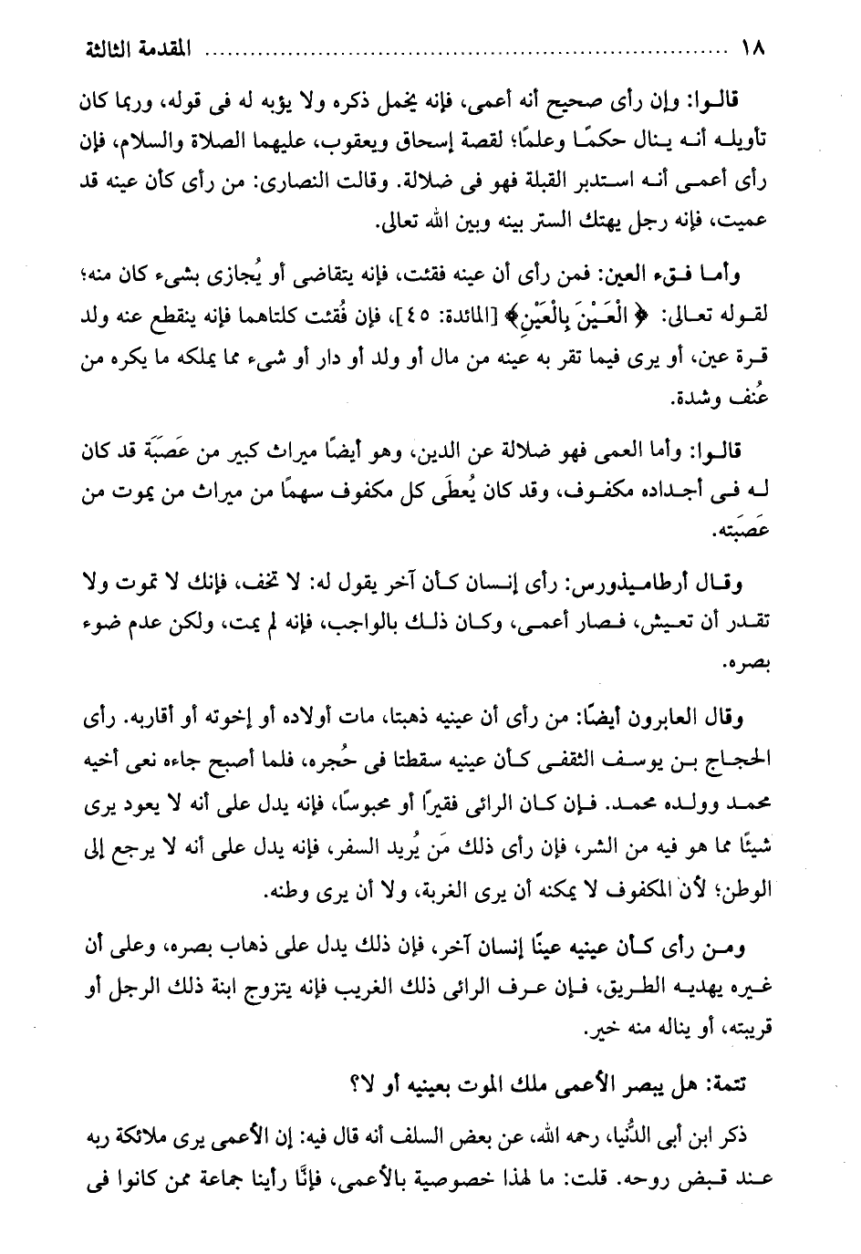 قالوا: وأما العمى فهو ضلالة عن الدين، وهو أيضاً ميراث كبير من عصبة قد كان له في أجداده مكفوف. وقد كان يعطى كل مكفوف سهماً من ميراث من يموت من عصبته. وقال أرطاميذورس: رأى إنسان كأن آخر يقول له لا تخف، فإنك لا تموت ولا تقدر أن تعيش، فصار أعمى وكان ذلك بالواجب. فإنه لم يمت ولكن عدم ضوء بصره.