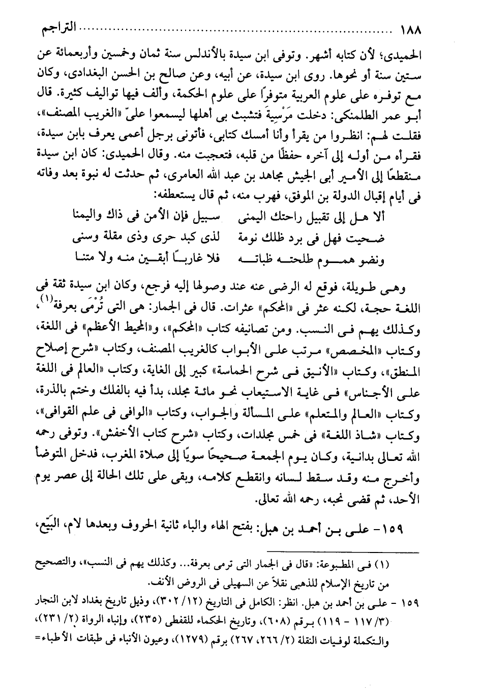 الحميدي، لان كتابه اشهر. وتوفي أبن سيده بالأندلس سنة ثمان وخمسين وأربعمائة عن ستين سنة أو نحوها. روى ابن سيده عن أبيه وعن صالح بن الحسن البغدادي. وكان مع توفره على علوم العربية، متوفراً على علوم الحكمة، وألف فيها تواليف كثيرة. قال أبو عمر الطلمنكي: دخلت مرسية فتشبث بي أهلها ليسمعوا علي الغريب المصنف. فقلت لهم: انظروا من يقرأ، وأنا أمسك كتابي، فأتوني برجل أعمى يعرف بابن سيده فقرأه من أوله إلى آخره، حفظاً من قلبه. فتعجبت منه. وقال الحميدي: كان ابن سيده منقطعاً إلى الأمير أبي الجيش مجاهد بن عبد الله العامري. ثم حدثت له نبوة بعد وفاته في أيام إقبال الدولة بن الموفق فهرب منه. ثم قال يستعطفه: