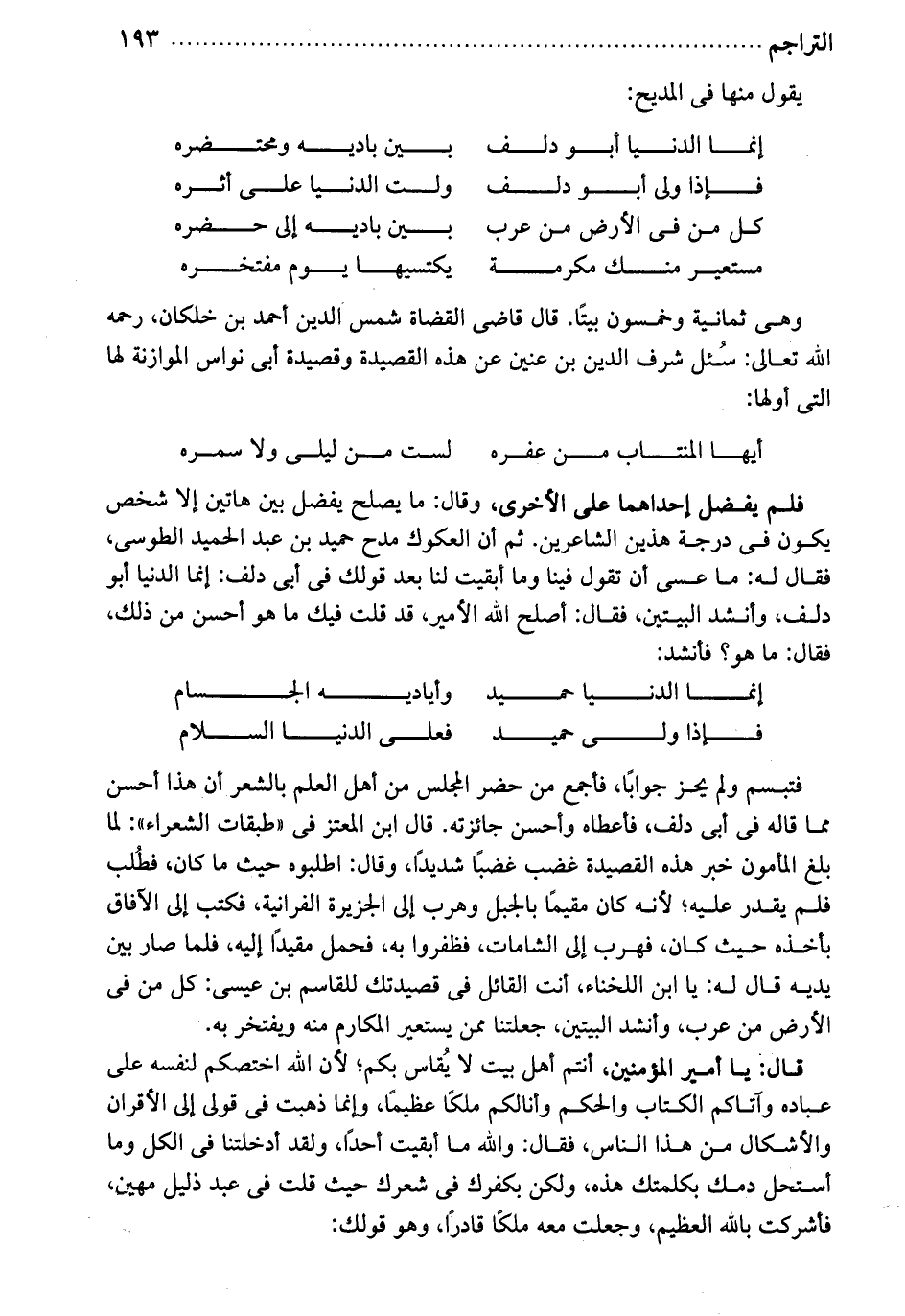 فلم يفضل أحداهما على الأخرى. وقال: ما يصلح يفضل بين هاتين إلا شخص يكون في درجة هذين الشاعرين. ثم أن العكوك مدح حميد بن عبد الحميد الطوسي فقال له: ما عسى أن تقول فينا، وما أبقيت لنا بعد قولك في أبي دلف: إنما الدنيا أبو دلف. وأنشد البيتن. فقال أصلح الله الأمير قد قلت ما هو أحسن من ذلك: فقال: ما هو. فأنشد