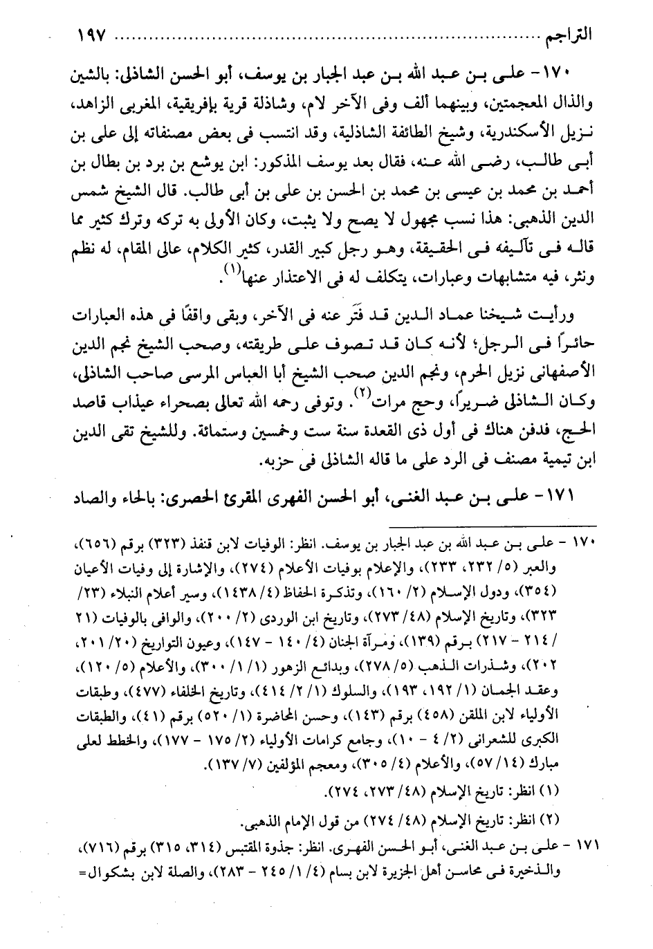 علي بن عبد الله: بن عبد الجبار بن يوسف. أبو الحسن الشاذلي بالشين والذال المعجميتن وبينهما ألف وفي الآخر لام. وشاذلة قرية بأفريقية. المغربي. الزاهد، نزيل الإسكندرية وشيخ الطائفة الشاذلية. وقد انتسب في بعض مصنفاته إلى علي بن أبي طالب رضي الله عنه. فقال: بعد يوسف المذكورين يوشع بن برد بن بطال بن أحمد بن محمد بن عيسى بن محمد بن الحسن بن علي بن أبي طالب. قال الشيخ شمس الدين الذهبي. هذا نسب مجهول لا يصح ولا يثبت وكان الأولى به تركه وترك كثير مما قاله في تآليفه من الحقيقة. وهو رجل، كبير القدر. كثير الكلام. عالي المقام. له نظم ونثر، فيه متشابهات وعبارات. يتكلف له في الاعتذار عنها. ورأيت شيخنا عماد الدين قد فتر عنه في الآخر، وبقي واقفاً في هذه العبارات حائراً في الرجل. لأنه كان قد تصوف على طريقته. وصحب الشيخ نجم الدين الأصفهاني نزيل الحرم، ونجم الدين صحب الشيخ أبا العباس المرسي صاحب الشاذلي. وكان الشاذلي ضريراً. وحج مرات. وتوفي رحمه الله تعالى بصحراء عيذاب، قاصد الحج. فدفن هناك في أول ذي القعدة سنة ست وخمسين وستمائة. والشيخ تقي الدين ابن تيمية مصنف في الرد على ما قاله الشاذلي في حزبه.