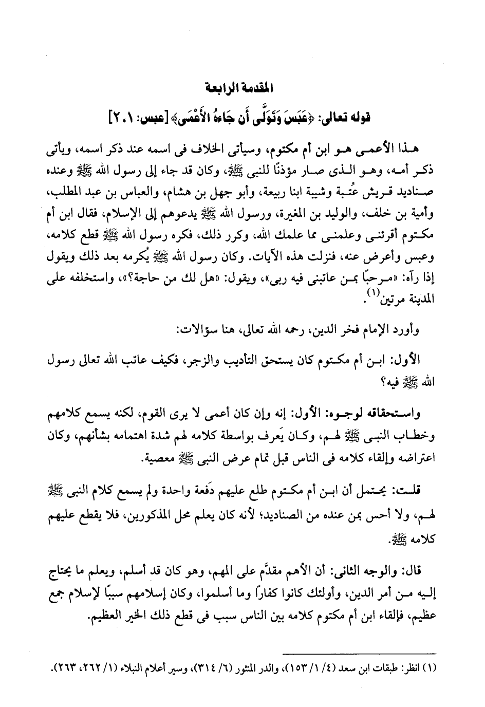 قال: والوجه الثاني. أن الأهم مقدم على المهم. وهو كان قد أسلم ويعلم ما يحتاج إليه من أمر الدين، وأولئك كانوا كفاراً وما أسلموا. وكان إسلامهم سبباً لإسلام جمع عظيم. فالقاء ابن أم مكتوم كلامه بين الناس سبب في قطع ذلك الخير العظيم.