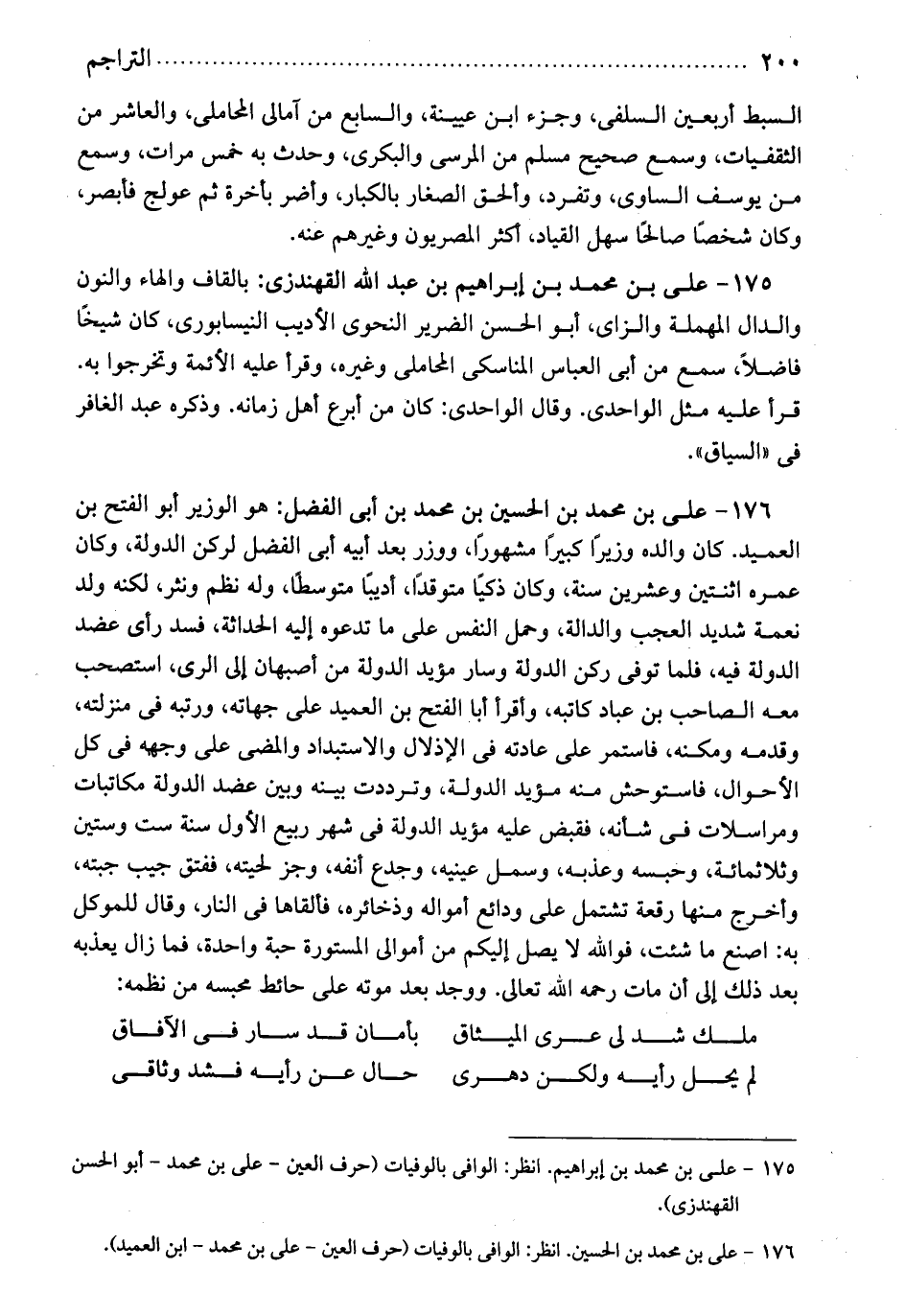 علي بن محمد: بن الحسين بن محمد بن أبي الفضل. هو الوزير أبو الفتح بن العميد. كان والده وزيراً كبيراً مشهوراً. ووزر أبيه أبي الفضل لركن الدولة. وكان عمره اثنتين وعشرين سنة. وكان ذكياً متوقداً أديباً متوسطاً. وله نظم ونثر. لكنه ولد نعمة شديد العجب والدالة. وحمل النفس على ما تدعوه إليه الحداثة. فسد رأي عضد الدولة فيه. فلما توفي ركن الدولة وسار مؤيد الدولة من أصبهان إلى الري، استصحب معه الصاحب بن عباد، كاتبه، وأقرأ أبا الفتح ابن العميد على جهاته، ورتبه في منزلته وقدمه ومكنه. فاستمر على عادته في الإدلال والاستبداد والمضي على وجهه في كل الأحوال. فاستوحش منه مؤيد الدولة وترددت بينه وبين عضد الدولة مكاتبات ومراسلات في شأنه. فقبض عليه مؤيد الدولة في شهر ربيع الأول سنة ست وستين وثلاثمائة. وحبسه وعذبه وسمل عينيه وجدع انفه وجز لحيته. ففتق جيب جبته وأخرج منها رقعةً تشتمل على ودائع أمواله وذخائره فألقاها في النار. وقال للموكل به: إصنع ما شئت، فوالله لا يصل إليكم من أموالي المستورة حبة واحدة. فما زال يعذبه بعد ذلك إلى أن مات رحمه الله تعالى. ووجد بعد موته، على حائط محبسه من نظمه: