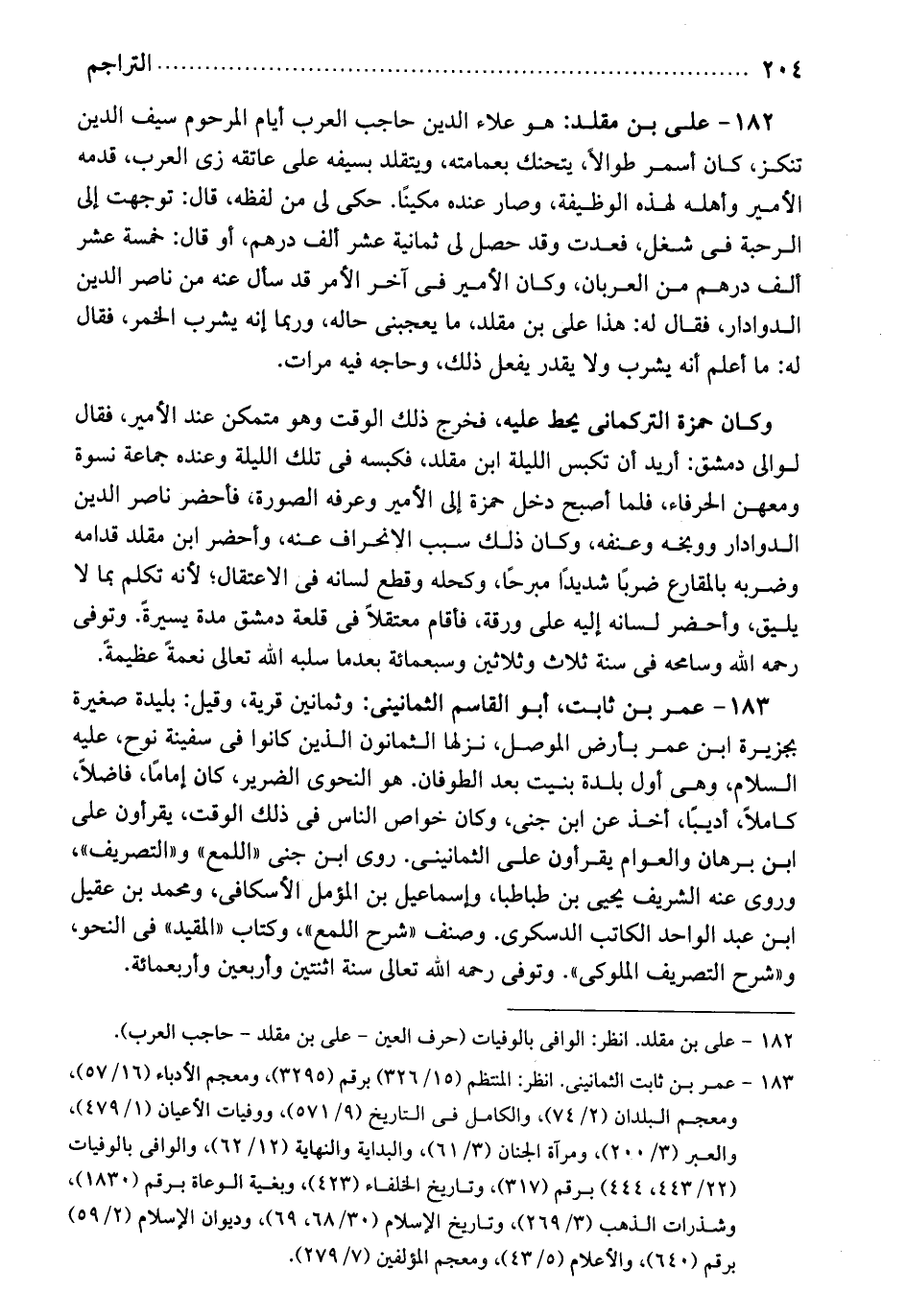 علي بن مقلد: هو علاء الدين حاجب العرب أيام المرحوم سيف الدين تنكز. كان أسمر طوالاً، يتحنك بعمامته ويتقلد بسيفه على عاتقه. زي العرب. قدمه الأمير وأهله لهذه الوظيفة وصار عنده مكيناً. حكي لي من لفظه، قال: توجهت إلى الرحبة في شغل فعدت وقد حصل لي ثمانية عشر ألف درهم. أو قال خمسة عشر ألف درهم من العربان، وكان الأمير في آخر الأمر قد سأل عنه من ناصر الدين الدوادار. فقال: له هذا علي بن مقلد ما يعجبني حاله وربما إنه يشرب الخمر، فقال له: ما أعلم أنه يشرب ولا يقدر يفعل ذلك وحاجه فيه مرات وكان حمزة التركماني يحط عليه فخرج ذلك الوقت وهو متمكن عند الأمير، فقال: لوالي دمشق أريد أن تكبس الليلة ابن مقلد فكبسه في تلك الليلة وعنده جماعة نسوة ومعهن الحرفاء، فلما اصبح دخل حمزة إلى الأمير وعرفه الصورة فأحضر ناصر الدين الدوادار ووبخه وعنفه وكان ذلك سبب الانحراف عنه وأحضر ابن مقلد قدامه وضربه بالمقارع ضرباً شديداً مبرحاً وكحله وقطع لسانه في الاعتقال لأنه تكلم بما لا يليق وأحضر لسانه إليه على ورقة فأقام معتقلاً في قلعة دمشق مدة يسيرةً. وتوفي رحمه الله وسامحه في سنة ثلاث وثلاثين وسبعمائة بعدما سلبه الله تعالى نعمةً عظيمةً.