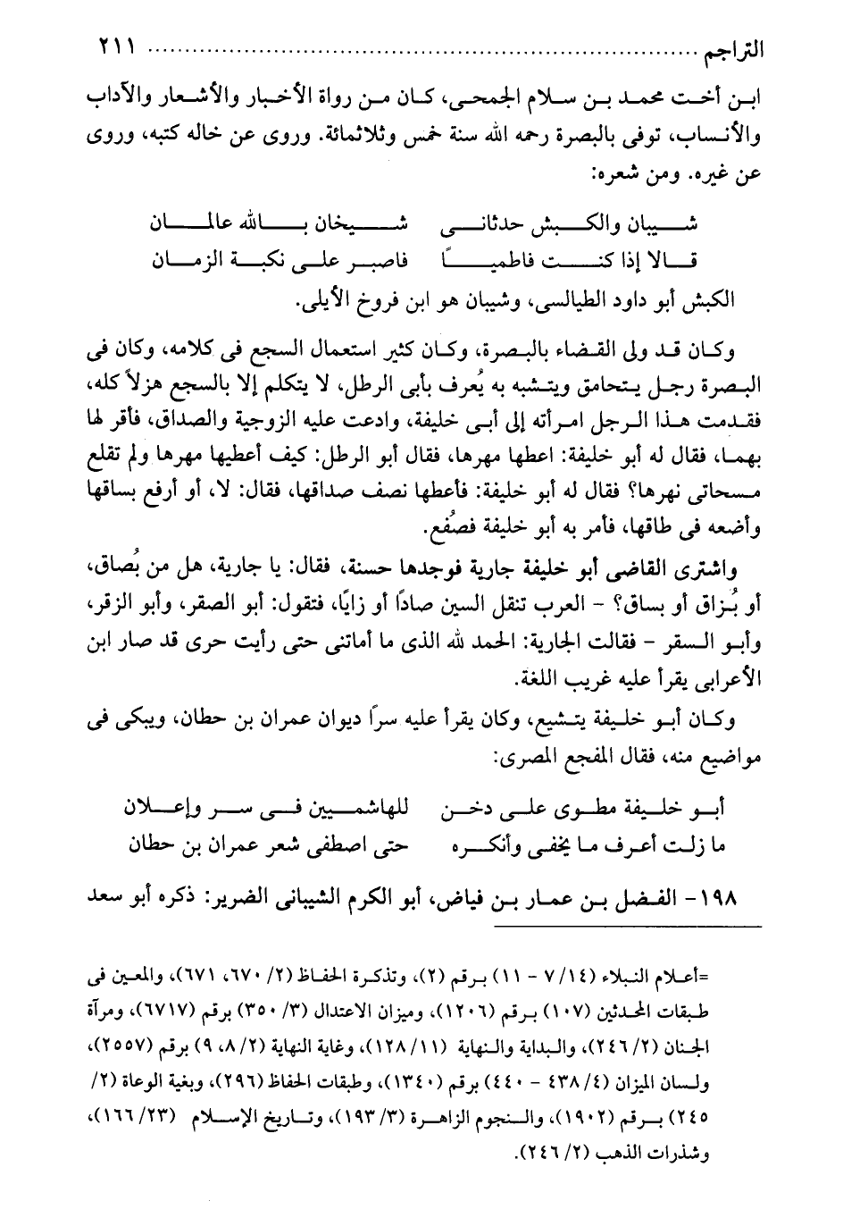 وكان قد ولي القضاء بالبصرة. وكان كثير استعمال السجع في كلامه. وكان في البصرة رجل يتحامق ويتشبه به يعرف بأبي الرطل لا يتكلم إلا بالسجع هزلاً، كله. فقدمت هذا الرجل امرأته إلى أبي خليفة، وادعت عليه الزوجية والصداق فاقر لها، بهما. فقال له أبو خليفة: إعطهما مهرها. فقال أبو الرطل: كيف. أعطيها مهرها، ولم تقلع مسحاتي نهرها. فقال له أبو خليفة: فأعطها نصف صداقها. فقال: لا. أو أرفع بساقها، واضعه في طاقها. فأمر به أبو خليفة فصفع. واشترى القاضي أبو خليفة جارية، فوجدها حسنة. فقال: يا جارية، هل من بصاق، أو بزاق، أو بساق؟ العرب تنقل السين صاداً أو زاياً. فتقول أبو الصقر وأبو الزقر، وأبو السقر. فقالت الجارية: الحمد لله الذي ما أماتني حتى رأيت حرى قد صارا بن الأعرابي يقرأ عليه غريب اللغة. وكان أبو خليفة يتشيع. وكان يقرأ عليه سراً ديوان عمران بن حطان، ويبكي في مواضيع منه. فقال المفجع المصري: