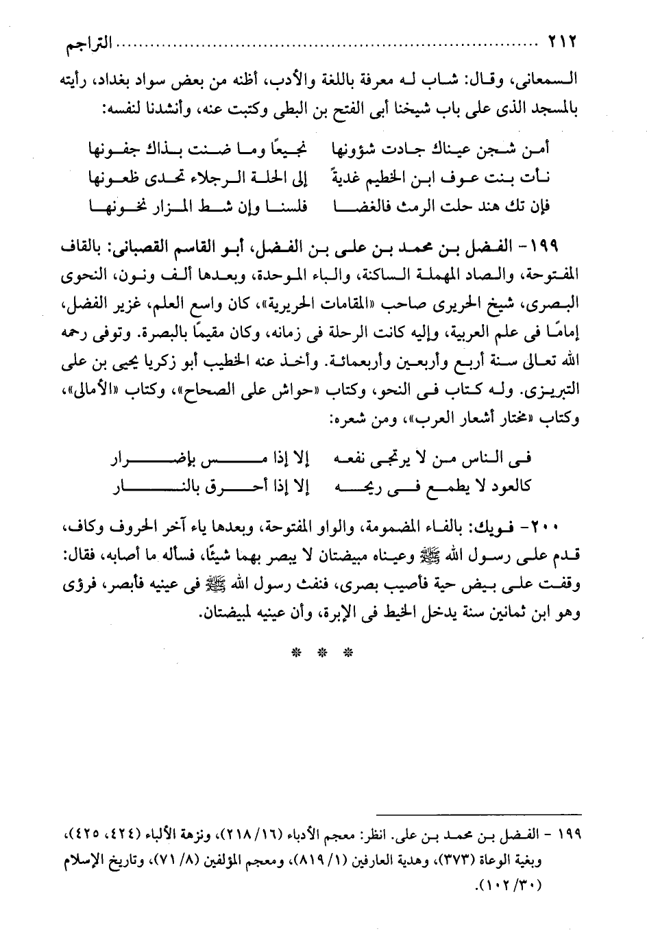 بن علي بن الفضل. أبو القاسم القصباني بالقاف المفتوحة والصاد المهملة الساكنة والباء الموحدة وبعدها ألف ونون. النحوي البصري. شيخ الحريري صاحب المقامات الحريرية. كان واسع العلم، غزير الفضل، إماما في علم العربية، وإليه كانت الرحلة في زمانه. وكان مقيماً بالبصرة. وتوفي رحمه الله تعالى سنة أربع وأربعين وأربعمائة. وأخذ عنه الخطيب أبو زكرياء يحيى بن علي التبريزي. وله كتاب في النحو. وكتاب حواش على الصحاح. وكتاب الأمالي. وكتاب مختار أشعار العرب. ومن شعره: