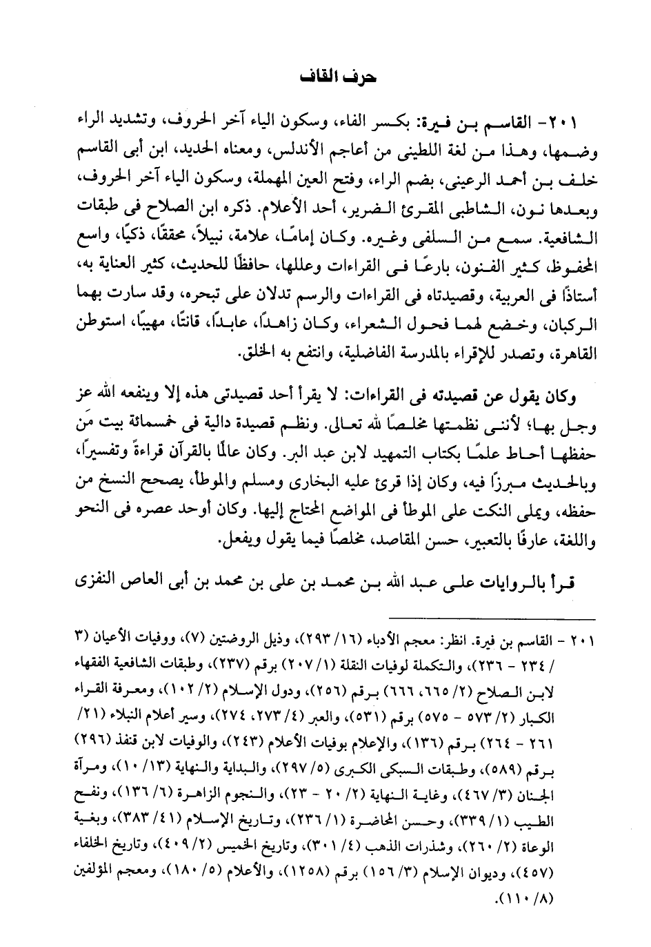 بكسر الفاء وسكون الياء آخر الحروف وتشديد الراء وضمها وهذا من لغة اللطيني من أعاجم الأندلس. ومعناه الحديد. إبن أبي القاسم خلف بن أحمد الرعيني بضم الراء وفتح العين المهملة وسكون الياء آخر الحروف وبعدها نون. الشاطبي المقرئ الضرير أحد الأعلام. ذكره ابن الصلاح في طبقات الشافعية. سمع من السلفي وغيره. وكان إماماً نبيلاً محققاً ذكياً، واسع المحفوظ كثير الفنون، بارعاً في القراآت وعللها، حافظاً للحديث، كثير العناية به، أستاذاً في العربية، وقصيدتاه في القراآت والرسم تدلان على تبخره. وقد سارت بهما الركبان وخضع لهما فحول الشعراء. وكان زاهداً عابداً قانتاً مهيباً. إستوطن القاهرة وتصدر للأقرباء بالمدرسة الفاضلية، وانتفع به الخلق. وكان يقول عن قصيدته في القراآت: لا يقرأ أحد قصيدتي هذه إلا وينفعه الله عز وجل بها، لأنني نظمتها مخلصاً لله تعالى. ونظم قصيدةً دالية في خمسمائة بيت، من حفظها أحاط علماً بكتاب التمهيد لإبن عبد البر. وكان عالماً بالقرآن قراءةً وتفسيراً، وبالحديث مبرزاً فيه. وكان إذا قرئ عليه البخاري ومسلم والموطأ، يصحح النسخ من حفظه، ويملي النكت على الموطأ في المواضع المحتاج إليها. وكان أوحد عصره في النحو واللغة، عارفاً بالتعبير، حسن، المقاصد مخلصاً فيما يقول ويفعل. قرأ بالروايات على عبد الله بن محمد بن علي بن محمد بن أبي العاص النفزي