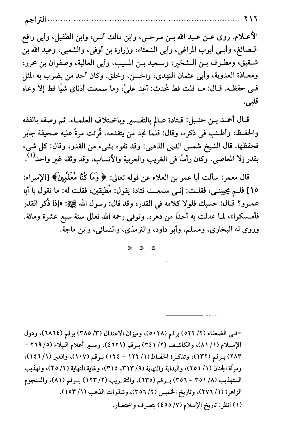 قال الشيخ شمس الدين الذهبي: وقد تفوه بشئ من القدر، وقال: كل شيء بقدر، إلا بالمعاصي. وكان رأساً في الغريب والعربية والأنساب. وقد وثقه غير واحد. قال معمر: سألت أبا عمر بن العلاء عن قوله تعالى: وما كنا معذبين. فلم يجيبني. فقلت: أني سمعت قتادة يقول: مطيقين. فقلت له: ما تقول يا أبا عمر؟ قال: حسبك فلولا كلامه في القدر، وقد قال: رسول الله صلى الله عليه وسلم. إذا ذكر القدر فامسكوا: لما عدلت به أحداً من دهره. وتوفي رحمه الله تعالى سنة سبع عشرة ومائة. وروى له البخاري ومسلم وأبو داود والترمذي والنسائي وابن ماجة.