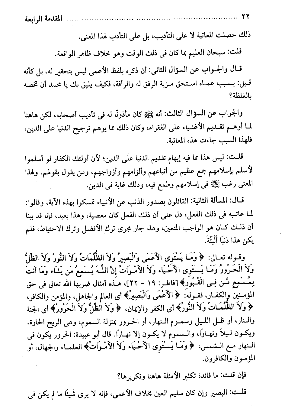 قال والجواب عن السؤال الثاني أن ذكره بلفظ الأعمى ليس بتحقير له بل كأنه قيل: بسبب عماه استحق مزية الرفق له والرأفة فكيف يليق بك يا محمد أن تخصه بالغلظة؟ والجواب عن السؤال الثالث أنه صلى الله عليه وسلم كان مأذوناً له في تأديب أصحابه: لكن ههنا لما أوهم تقديم الأغنياء على الفقراء وكان ذلك ما يوهم ترجيح الدنيا على الدين، فلهذا السبب جاءت هذه المعاتبة.