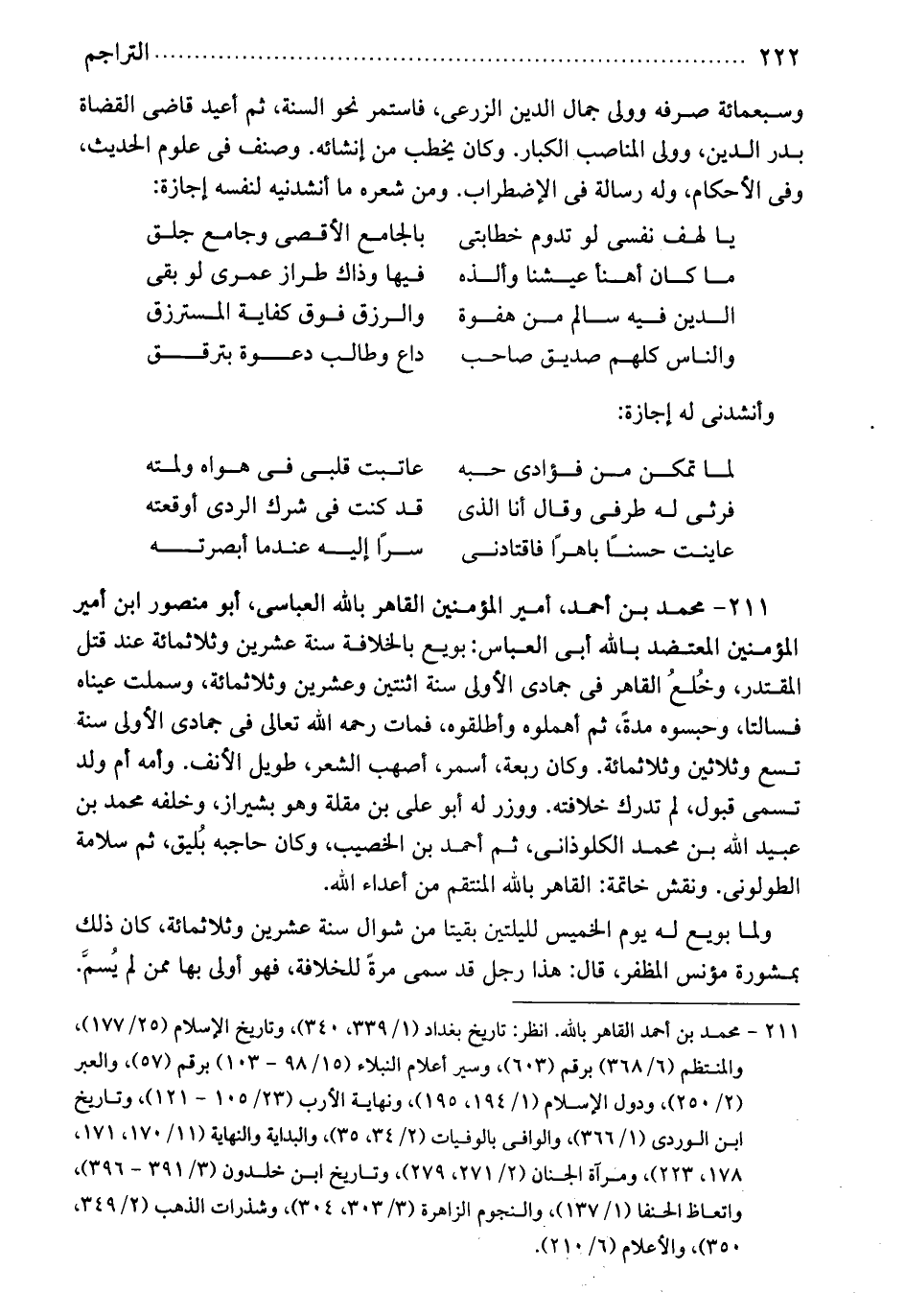 أمير المؤمنين القاهر بالله العباسي. أبو منصور بن أمير المؤمنين المعتضد بالله أبي العباس. بويع بالخلافة سنة عشرين وثلاثمائة عند قتل المقتدر. وخلع القاهر في جمادى الأولى سنة اثنتين وعشرين وثلاثمائة، وسملت عيناه فسالتا وحبسوه مدةً. ثم أهملوه وأطلقوه فمات رحمه الله تعالى في جمادى الأولى سنة تسع وثلاثين وثلاثمائة. وكان، ربعة أسمر أصهب الشعر، طويل الأنف. وأمه أم ولد تسمى قبول، لم تدرك خلافته.