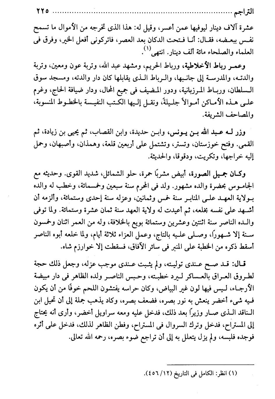قال قد صح عندي توليته ولم يثبت عندي موجب عزله. وجعل ذلك حجة لطروق العراق بالعساكر ليرد خطبته. وحبس الناصر ولده الظاهر في دار مبيضة الأرجاء، ليس فيها لون غير البياض. وكان حراسه يفتشون اللحم، خوفاً من أين يكون فيه شيء أخضر ينعش به نور بصره، فضعف بصره وكاد يذهب جملة، إلى أن تخيل ابن الناقد الذي صار وزيراً بعد ذلك فدخل عليه، ومعه سراويل اخضر وارى أنه يحتاج إلى المستراح، فدخل وترك السروال في المستراح. وفطن الظاهر لذلك. فدخل على أثره فوجده فلبسه. ولم يزل يتعلل به إلى أن تراجع ضوء بصره. رحمه الله تعالى.