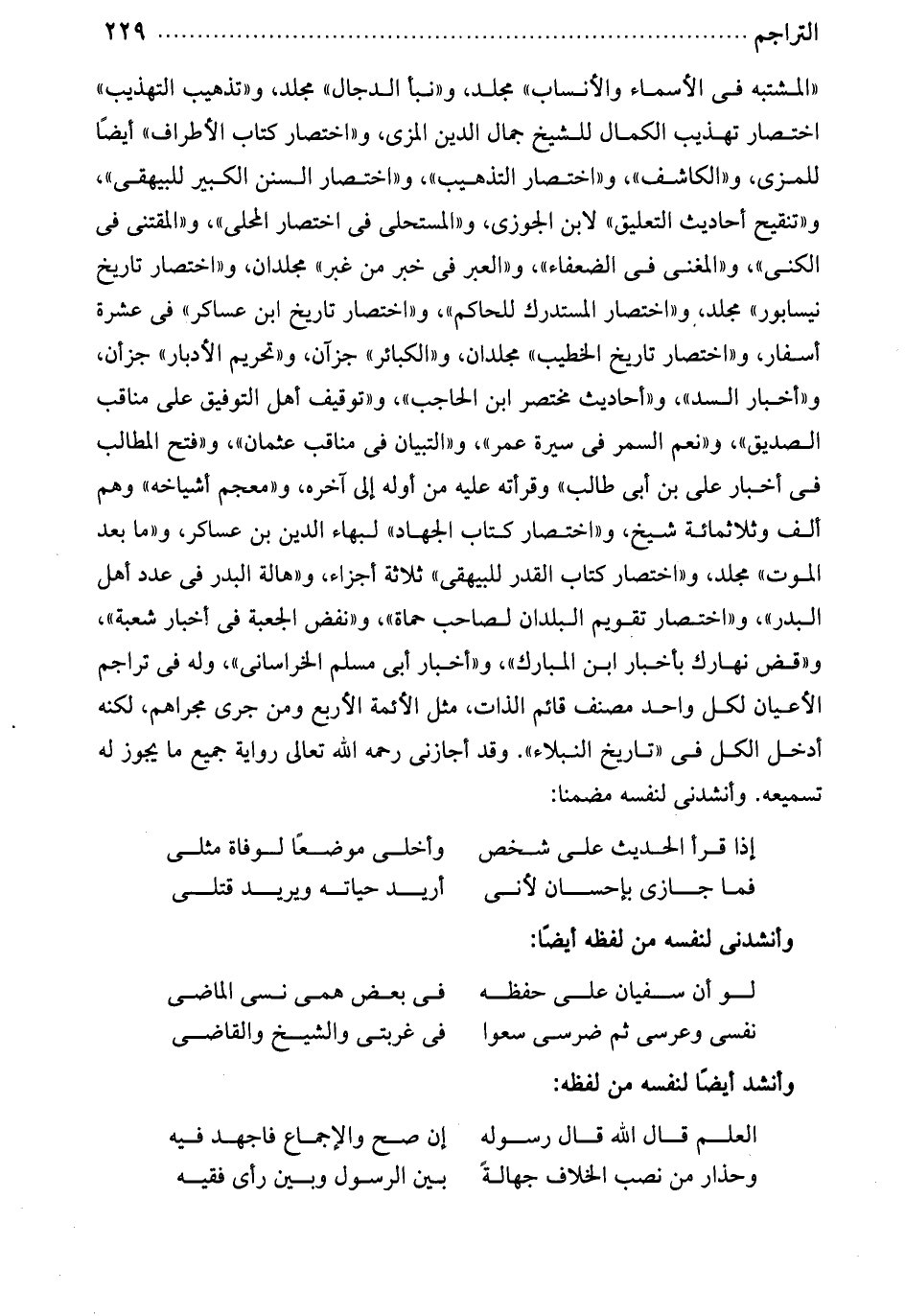 المشتبه في الأسماء والأنساب، مجلد. نبأ الدجال، مجلد. تذهيب التهذيب، اختصار تهذيب الكمال للشيخ جمال الدين المزي. واختصار كتاب الأطراف، أيضاً للمزي. والكاشف، اختصار التذهيب. اختصار السنن الكبير للبيهقي. تنقيح أحاديث التعليق لإبن الجوزي. المستحلى في اختصار المحلى. المقتنى في الكنى. المغنى في الضعفاء. العبر في خبر من غبر، مجلدان. إختصار تاريخ نيسابور، مجلد. إختصار المستدرك للحاكم. إختصار تاريخ إبن عساكر، في عشرة أسفار. إختصار تاريخ الخطيب، مجلدان. الكبائر، جزآن. تحريم الأدبار، جزآن. أخبار السد. أحاديث مختصر إبن الحاجب. توقيف أهل التوفيق على مناقب الصديق. نعم السمر في سيرة عمر. التبيان في مناقب عثمان. فتح المطالب في أخبار علي بن أبي طالب وقرأته عليه من أوله إلى آخره. معجم أشياخه، وهم ألف وثلاثمائة شيخ. إختصار كتاب الجهاد، لبهاء الدين بن عساكر. ما بعد الموت، مجلد. إختصار كتاب القدر للبيهقي، ثلاثة أزاء. هالة البدر في عدد أهل البدر. إختصار تقويم البلدان لصاحب حماة. نفض الجعبة في أخبار شعبة. قض نهارك بأخبار إبن المبارك. أخبار أبي مسلم الخراساني. وله في تراجم الأعيان لكل واحد مصنف قائم الذات مثل الأئمة الأربع، ومن جرى مجراهم. لكنه أدخل الكل في تاريخ النبلاء. وقد أجازني رحمه الله تعالى رواية جميع ما يجوز له تسميعه. وأنشدني لنفسه مضمنا: