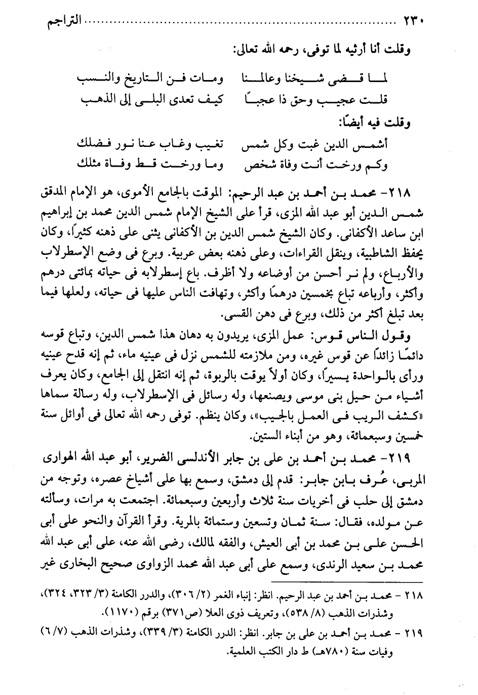 محمد بن أحمد: بن عبد الرحيم، الموقت بالجامع الأموي. هو الإمام المدقق شمس الدين أبو عبد الله المزي. قرأ على الشيخ الإمام شمس الدين محمد بن إبراهيم بن ساعد الأكفاني. وكان الشيخ شمس الدين ابن الأكفاني يثني على ذهنه كثيراً. وكان يحفظ الشاطبية، وينقل القراآت، وعلى ذهنه بعض عربية. وبرع في وضع الاسطرلاب والأرباع، ولم نر أحسن من أوضاعه ولا اظرف. يباع اسطرلابه في حياته بمائتي درهم واكثر. وأرباعه تباع بخمسين درهماً وأكثر. وتهافت الناس عليها في حياته. ولعلها فيما بعد تبلغ أكثر من ذلك. وبرع في دهن القسي. وقول الناس قوس: عمل المزي، يريدون به دهان هذا شمس الدين. وتباع قوسه دائماً زائداً عن قوس غيره. ومن ملازمته للشمس، نزل في عينيه ماء. ثم إنه قدح عينيه ورأى بالواحدة يسيراً. وكان أولاً يوقت بالربوة، ثم إنه انتقل إلى الجامع. وكان يعرف أشياء من حيل بني موسى ويصنعها. وله رسائل في الاسطرلاب، وله رسالة سماها كشف الريب في العمل بالجيب، وكان ينظم. توفي رحمه الله تعالى في أوائل سنة خمسين وسبعمائة، وهو من أبناء الستين.