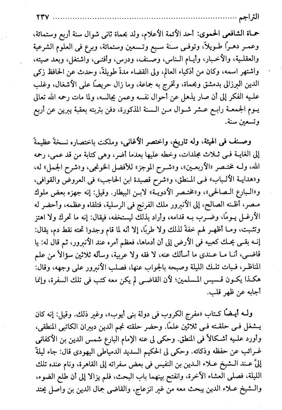 حماه الشافعي الحموي. أحد الأئمة الأعلام. ولد بحماه ثاني شوال سنة أربع وستمائة وعمر دهراً طويلاً. وتوفي سنة سبع وتسعين وستمائة. وبرع في العلوم الشرعية والعقلية، والأخبار، وأيام الناس. وصنف ودرس، وأفتى، واشتغل. وبعد صيته واشتهر اسمه. وكان من أذكياء العالم. ولي القضاء مدةً طويلةً. وحدث عن الحافظ زكي الدين البرزالي بدمشق وبحماه. وتخرج به جماعة. وما زال حريصاً على الإشغال، وغلب عليه الفكر إلى أن صار يذهل عن احوال نفسه وعمن يجالسه. ولما مات رحمه الله تعالى يوم الجمعة رابع عشري شوال من السنة المذكورة، دفن بتربته بعقبة يبرين عن أربع وتسعين سنة. وصنف في الهيئة. وله تاريخ. واختصر الأغاني. وملكت باختصاره نسخةً عظيمةً إلى الغاية في ثلاث مجلدات، وخطه عليها بعد ما أضر، وهي كتابة من قد عمي. رحمه الله! وله مختصر الأربعين. وشرح الموجز للأفضل الخونجي. وشرح الجمل له. وهداية الألباب في المنطق. وشرح قصيدة ابن الحاجب في العروض والقوافي. والبارع الصالحي. ومختصر الأدوية لابن البيطار.