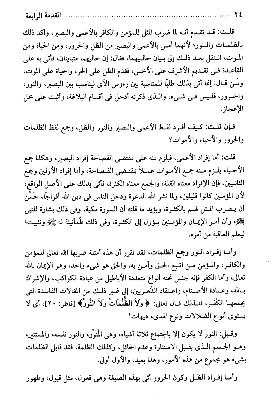 فإن قلت: كيف أفرد لفظ الأعمى والبصير والنور والظل وجمع لفظ الظلمات والحرور والأحياء والأموات؟ قلت: أما إفراد الأعمى فيلزم منه على مقتضى الفصاحة إفراد البصير، وهكذا جمع الأحياء يلزم منه جمع الأموات، عملاً بمقتضى الفصاحة. وأما إفراد الأولين وجمع الثانيين فإن الإفراد معناه القلة والجمع معناه الكثرة. فأتى بذلك على الأصل الواقع لأن المؤمنين كانوا قليلين. ولما نشر الله الدعوة ودخل الناس في دين الله أفواجاً حسن أن يضرب المثل لهم بالكثرة. ويؤيد ما قلته أن السورة مكية. وفي ذلك بشارة للنبي صلى الله عليه وسلم وأن أمر الإيمان والمؤمنين يؤول إلى الكثرة. وفي ذلك طمأنينة له صلى الله عليه وسلم وتثبيت ليعلم العاقبة من أمره. وأما إفراد النور، وجمع الظلمات. فقد تقرر أن هذه أمثلة ضربها الله تعالى للمؤمن والكافر. والمؤمن من اتبع الحق وآمن به. والحق هو شيء واحد وهو الإيمان بالله تعالى. وأما الكفر، فإنه جنس تحته أنواع متعددة الأباطيل: من عبادة الكواكب والإشراك بالله وعبادة الأصنام واعتقاد الدهريين إلى غير ذلك من المقالات الفاسدة التي يجمعها الكفر. فلذلك قال تعالى: ولا الظلمات ولا النور. أي لا يستوي أنواع الضلالات ونوع الهدى. هيهات! وقيل: النور لا يكون إلا باجتماع ثلاثة أشياء وهي المنور والنور نفسه والمستنير وهو الجسم الذي يقبل الاستنارة وعدم الحائل وكذلك الظلمة. فقد قابل الظلمات بشيء هو مجموع من هذه الأمور.