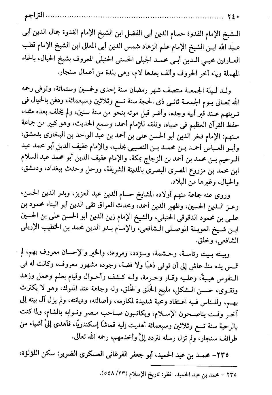 وبيته بيت رئاسة وحشمة وسؤدد ومروءة، والخير والإحسان معروف بهم. لم تمس يده منذ عاش إلى أن توفي ذهباً ولافضة. وجوده مشهور معروف. وكانت له في النفوس هيبةً، وعليه وقار وحرمة. وله كشف وأحوال وقيام بعلم وعمل وزهد وتقوى. حسن الشكل مليح الخلق والخلق. وله وجاهة عند الملوك، وهولا يكترث بهم. وللناس فيه إعتقاد ومحبة شديدة، لمكارمه وأصالته وديانته. ولم يزل بيته إلى آخر وقت يناصحون الإسلام ويكاتبون صاحب مصر ونوابه بالشام. ولما كنت بالرحبة سنة تسع وثلاثين وسبعمائة، أهديت إليه قماشاً اسكندرياً، فأهدى إلى أشياء من طرائف سنجار. ولم تزل رسله تتردد إلي وأخدمهم. رحمه الله تعالى! محمد بن عبد الحميد: أبو جعفر الفرغاني العسكري الضرير. سكن اللؤلؤة.
