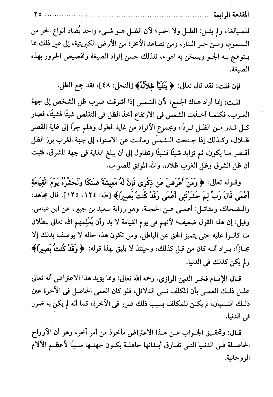 فإن قلت: فقد قال تعالى تتفيأ ظلاله، فقد جمع الظل. قلت: إنما أراد هناك الجمع لأن الشمس إذا أشرقت ضرب ظل الشخص إلى جهة الغرب فكلما أخذت الشمس في الارتفاع أخذ الظل في التقلص شيئاً فشيئاً فصار كل قدر من الظل فرداً، ومجموع الأفراد من غاية الطول وهلم جراً إلى غاية القصر ظلال. وكذلك إذا جنحت الشمس ومالت عن الاستواء إلى جهة الغرب، برز الظل أقصر ما يكون، ثم تزايد شيئاً فشيئاً وتطاول إلى أن يبلغ الغاية في جهة المشرق. فثبت أن ظل الشرق وظل الغرب ظلال. والله الموفق للصواب.