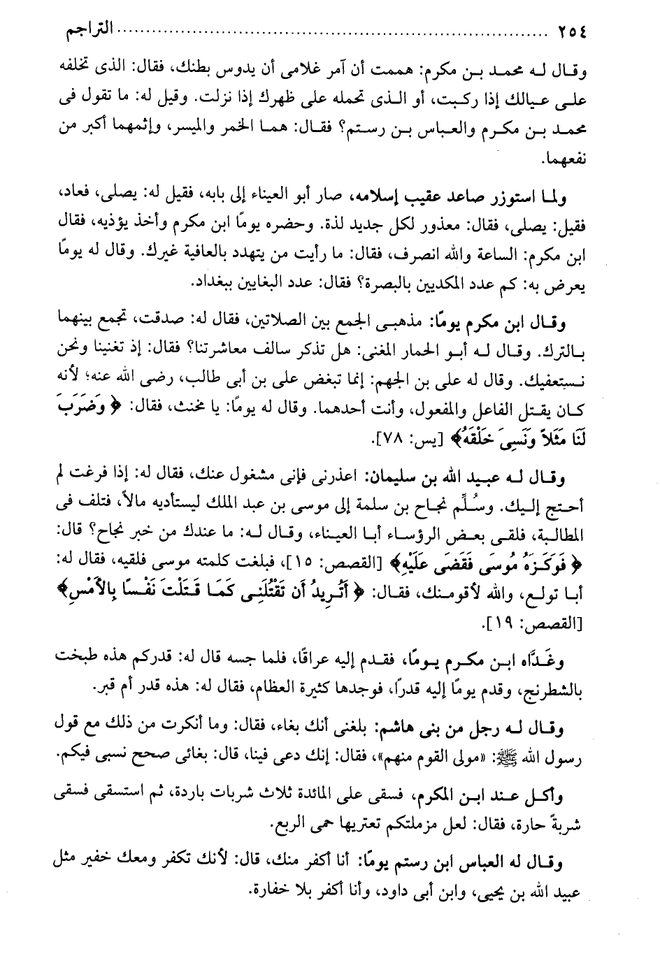 وقال له محمد بن مكرم: هممت أن آمر غلامي أن يدوس بطنك. فقال: الذي تخلفه على عيالك إذا ركبت، أو الذي تحمله على ظهرك إذا نزلت. وقيل له: ما تقول في محمد بن مكرم والعباس بن رستم. فقال: هما. الخمر والميسر وإثمهما من نفعهما، ولما استوزر صاعد عقيب إسلامه، صار أبو العيناء إلى بابه. فقيل له يصلي، فعاد. فقيل يصلي. فقال: معذور لكل جديد لذة. وحضره يوماً ابن مكرم، وأخذ يؤذيه، فقال ابن مكرم، الساعة والله انصرف. فقال ما رأيت من يتهدد بالعافية غيرك. وقال له: يوماً يعرض به: كم عدد المكديين بالبصرة، فقال. عدد البغايين ببغداد. وقال ابن مكرم يوماً: مذهبي الجمع بين الصلاتين. فقال له: صدقت. تجمع بينهما بالترك. وقال له أبو الحمار المغني: هل تذكر سالف معاشرتنا، فقال: إذ تغنينا ونحن نستعفيك. وقال له علي بن الجهم: إنما تبغض علي بن أبي طالب رضي الله عنه لأنه كان يقتل الفاعل والمعول وأنت أحدهما، وقال له يوماً: يا مخنث، فقال وضرب لنا مثلاً ونسي خلقه. وقال له عبيد اله بن سليمان: اعذرني فإني مشغول عنك، فقال له: إذا فرغت لم أحتج إليك. وسلم نجاح بن سلمة. إلى موسى بن عبد الملك ليستاديه مالاً. فتلف في المطالبة. فلقي بعض الرؤساء أبا العيناء، وقال له: ما عندك من خير نجاح قال فوكزه موسى فقضى عليه. فبلغت كلمته موسى فلقيه، فقال له: أبي تولع والله لأقومنك، فقال: أتريد أن تقتلني كما قتلت نفساً بالأمس. وغداه ابن مكرم يوماً. فقدم إليه عراقاً فلما جسه قال له: قدركم هذه طبخت بالشطرنج. وقدم يوماً إليه قدراً. فوجدها كثيرة العظام، فقال له: هذه قد رأم قبر. وقال له رجل من بني هاشم: بلغني أنك بغاء، فقال: وما أنكرت من ذلك مع قول رسول الله صلى الله عليه وسلم. مولى القوم منهم، فقال: إنك دعي فينا. قال: بغائي صحح نسبي فيكم. وأكل عند ابن المكرم. فسقى على المائدة ثلاث شربات باردة. ثم استسقى فسقى شربةً، فقال: لعل مزملتكم تعتريها حمى الربع. وقال له العباس ابن رستم يوماً: أنا أكفر منك، قال لأنك تكفر ومعك خفير مثل عبيد الله بن يحيى وابن أبي داود، وأنا أكفر بلا خفارة.