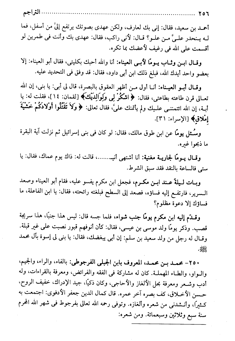 محمد بن محمد: المعروف بابن الجبلي. الفرجوطي بالفاء والراء والجيم والواو والطاء المهملة. كان له مشاركة في الفقه والفرائض. ومعرفة بالقرآت. وله أدب وشعر ومعرفة بحل الألغاز والأحاجي. وكان ذكياً. جيد الإدراك. خفيف الروح. حسن الأخلاق. كف بصره آخر عمره. قال كمال الدين جعفر الأدفوي: اجتمعت به كثيراً وأنشدني من شعره وألغازه. وتوفي رحمه الله تعالى بفرجوط. في شهر الله المحرم سنة سبع وثلاثين وسبعمائة. ومن شعره: