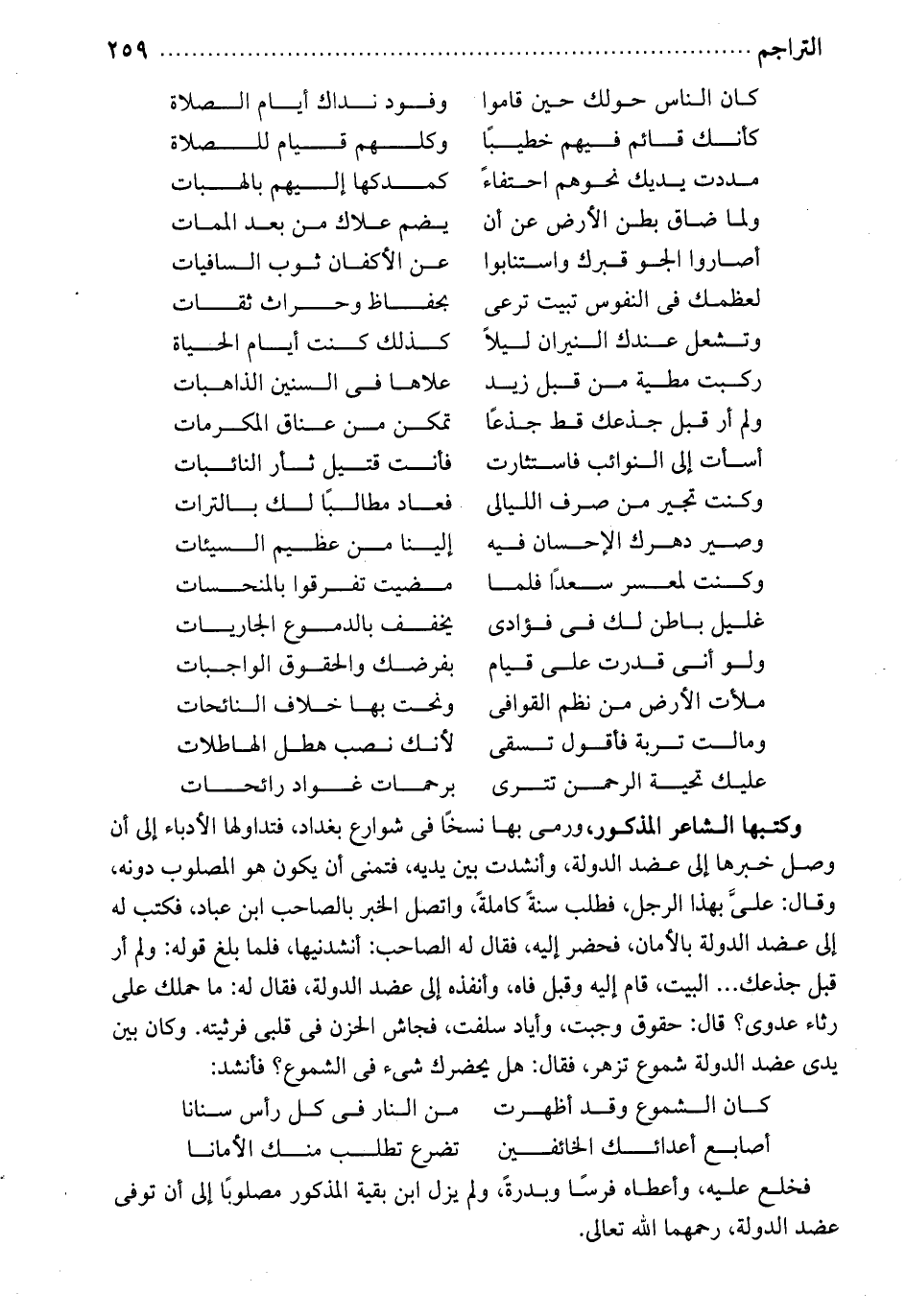 وكتبها الشاعر المذكور. ورمى بها نسخاً في شوارع بغداد. فتداولها الأدباء إلى أن وصل خبرها إلى عضد الدولة وأنشدت بين يديه. فتمنى أن يكن هو المصلوب دونه. وقال: علي بهذا الرجل. فطلب سنةً كاملةً واتصل الخبر بالصاحب ابن عباد فكتب له إلى عضد الدولة بالأمان فحضر إليه. فقال له الصاحب: أنشدنيها فلما بلغ قوله ولم أر قبل جذعك البيت قام إليه وقبل وفاته وأنفذه إلى عضد الدولة. فقال له: ما حملك على رثاء عدوي. قال: حقوق وجبت، وأياد سلفت فجاش الحزن في قلبي فرثيته. وكان بين يدي عضد الدولة شموع تزهر. فقال: هل يحضرك شيء في الشموع. فأنشد: