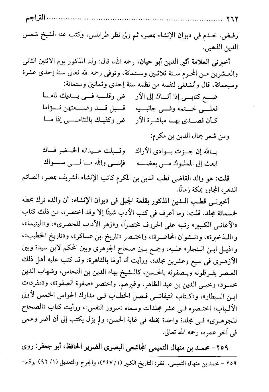 قلت: هو والد القاضي قطب الدين بن المكرم، كاتب الإنشاء الشريف بمصر، الصائم الدهر، المجاور بمكة زماناً. أخبرني قطب الدين المذكور بقلعة الجبل في ديوان الإنشاء أن والده ترك بخطه خمسمائة مجلد. قلت: وما أعرف في كتب الأدب شيئاً إلا وقد اختصره. من ذلك: كتاب الأغاني الكبير، رتبه على الحروف مختصراً. وزهر الآداب للحصري. واليتيمة. والذخيرة. ونشوان المحاضرة. واختصر تاريخ ابن عساكر. وتاريخ الخطيب. وذيل ابن النجار عليه. وجمع بين صحاح الجوهري، وبين المحكم لابن سيده، وبين الأزهري، في سبع وعشرين مجلدة. ورأيت أنا أولها بالقاهرة، وقد كتب عليه أهل ذلك العصر يقرظونه ويصفونه بالحسن: كالشيخ بهاء الدين بن النحاس، وشهاب الدين محمود، ومحيي الدين بن عبد الظاهر، وغيرهم. واختصر صفوة الصفوة. ومفردات ابن البيطار. وكتاب التيفاشي. فصل الخطاب في مدارك الحواس الخمس لأولى الألباب، اختصره في عشر مجلدات، وسماه سرور النفس. ورأيت كتاب الصحاح للجوهري، في مجلدة واحدة بخطه، في غاية الحسن. ولم يزل يكتب لي أن أضر وعمي في آخر عمره. رحمه الله تعالى.