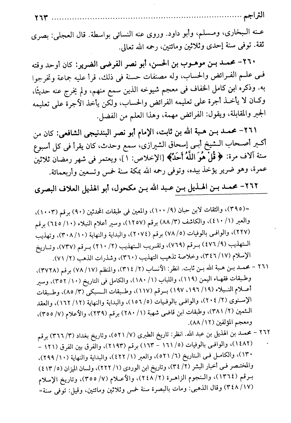 عنه البخاري ومسلم وأبو داود. وروى عنه النسائي بواسطة. قال العجلي: بصري ثقة. توفي سنة إحدى وثلاثين ومائتين. رحمه الله تعالى. محمد بن موهوب: بن السحن. أبو نصر الفرضي الضرير. كان أوحد وقته في علم الفرائض والحساب. وله مصنفات حسنة في ذلك. قرأ عليه جماعة وتخر جوابه. وذكره ابن كامل الخفاف في معجم شيوخه الذين سمع منهم، ولم تخرج عنه حديثاً. وكان لا يأخذ أجرة على تعليمه الفرائض والحساب. ولكن يأخذ الأجرة على تعليمه الجبر والمقابلة، ويقول: الفرائض مهمة. وهذا العلم من الفضل.