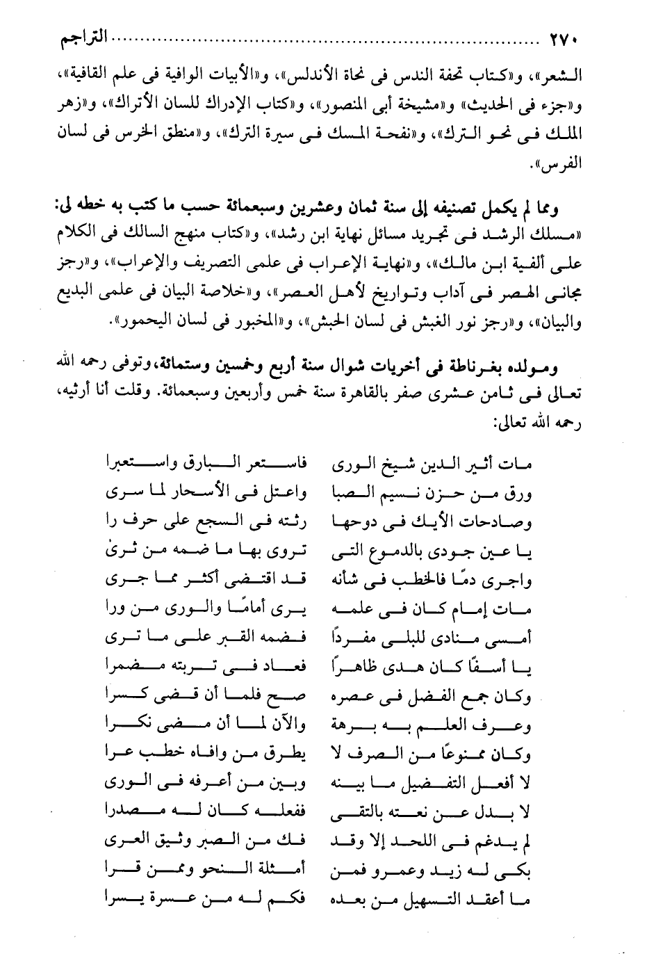 ومولده بغرناطة في أخريات شوال سنة أربع وخمسين وستمائة. وتوفي رحمه الله تعالى في ثامن عشري صفر بالقاهرة سنة خمس وأربعين وسبعمائة. وقلت أنا أرثيه رحمه الله تعالى: