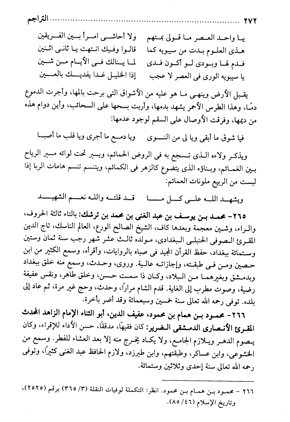 محمود بن همام: بن محمود. عفيف الدين. أبو الثناء. الإمام الزاهد المحدث المقرئ الأنصاري الدمشقي الضرير. كان فقيهاً مدققاً حسن الأداء للإقراء. وكان يصوم الدهر ويلازم الجامع. ولا يكاد يخرج منه إلا بعد العشاء للفطر. وسمع من الخشوعي، وابن عساكر، وطبقتهم، وابن طبرزد. ولازم الحافظ عبد الغني كثيراً. وتوفي رحمه الله تعالى سنة إحدى وثلاثين وستمائة.