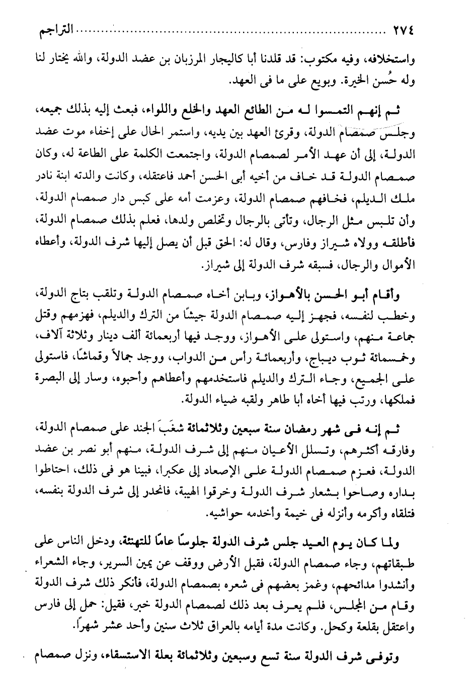 واستخلافه. وفيه مكتوب: قد قلدنا ابا كاليجار المرزبان بن عضد الدولة، والله يختار لنا وله حسن الخيرة. وبويع على ما في العهد. ثم إنهم التمسوا له من الطائع العهد والخلع واللواء. فبعث إليه بذلك جميعه. وجلس صمصام الدولة وقرئ العهد بين يديه. واستمر الحال على إخفاء موت عضد الدولة، إلى أن تمهد الامر لصمصام الدولة، واجتمعت الكلمة على الطاعة له. وكان صمصام الدولة، قد خاف من أخيه أبي الحسن أحمد فاعتقله، وكانت والدته ابنة نادر ملك الديلم، فخافهم صمصام الدولة. وعزمت أمه على كبس دار صمصام الدولة، وأن تلبس مثل الرجال، وتأتي بالرجال، وتخلص ولدها. فعلم بذلك صمصام الدولة فأطلقه وولاه شيراز وفارس. وقال له: الحق، قبل أن يصل إليها شرف الدولة. وأعطاه الأموال والرجال. فسبقه شرف الدولة إلى شيراز. وأقام أبو الحسن بالأهواز. بأبن أخاه صمصام الدولة وتلقب بتاج الدولة. وخطب لنفسه. فجهز إليه صمصام الدولة جيشاً من الترك والديلم، فهزمهم وقتل جماعة منهم. واستولى على الأهواز ووجد فيها أربعمائة ألف دينار وثلاثة آلاف وخمسمائة ثوب ديباج وأربعمائة رأس من الدواب. ووجد جمالاً وقماشاً. فاستولى على الجميع. وجاء الترك والديلم فاستخدمهم وأعطاهم وأحبوه وسار إلى البصرة فملكها ورتب فيها أخاه أبا طاهر ولقبه ضياء الدولة. ثم إنه في شهر رمضان سنة سبعين وثلاثمائة، شغب الجند على صمصام الدولة وفارقه أكثرهم وتسلل الأعيان منهم إلى شرف الدولة، منهم أبو نصر بن عضد الدولة. فعزم صمصام الدولة على الإصعاد إلى عكبرا. فبينا هو في ذلك. احتاطوا بداره وصاحوا بشعار شرف الدولة وخرقوا الهيبة. فانحدر إلى شرف الدولة بنفسه فتلقاه وأكرمه وأنزله في خيمة وأخدمه حواشيه ولما كان يوم العيد. جلس شرف الدولة جلوساً عاماً للتهنئة. ودخل الناس على طبقاتهم وجاء صمصام الدولة، فقبل الأرض ووقف عن يمين السرير. وجاء الشعراء وأنشدوا مدائحهم وغمز بعضهم في شعره بصمصام الدولة خبر. فقيل: حمل إلى فارس واعتقل بقلعة وكحل. وكانت مدة ايامه بالعراق ثلاث سنين وأحد عشر شهراً.