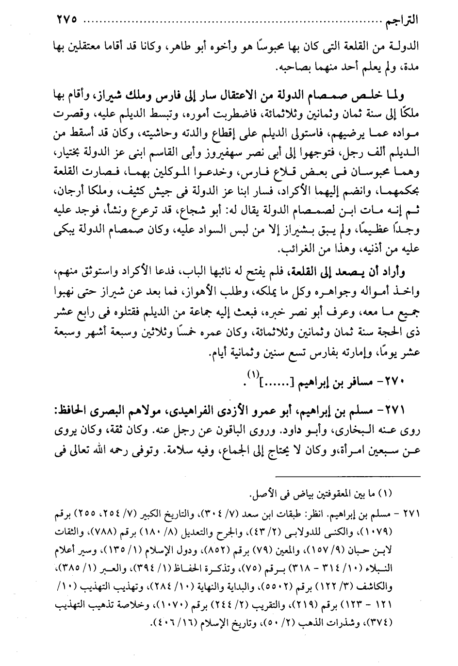مسافر بن إبراهيم: مسلم بن إبراهيم: أبو عمرو. الأزدي الفراهيدي. مولاهم البصري الحافظ؟ روى عنه البخاري وأبو داود. وروى الباقون عن رجل عنه. وكان ثقة. وكان يروي عن سبعين امرأة. وكان لا يحتاج إلى الجماع وفيه سلامة. وتوفي رحمه الله تعالى في