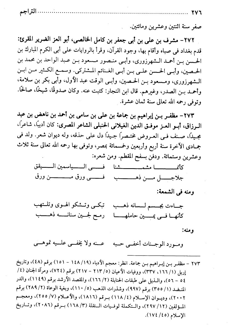 مظفر بن إبراهيم: بن جماعة بن علي بن سامي بن أحمد بن ناهض بن عبد الرزاق. أبو العز. موفق الدين الغيلاني الحنبلي الشاعر المصري. كان أديباً شاعراً مجيداً. صنف في العروض مختصراً جيداً، دل على حذقه. وله ديوان شعر. ولد في جمادى الآخرة سنة أربع واربعين وخمسمائة بمصر. وتوفي بها رحمه الله تعالى سنة ثلاث وعشرين وستمائة. ودفن بسفح المقطم. ومن شعره: