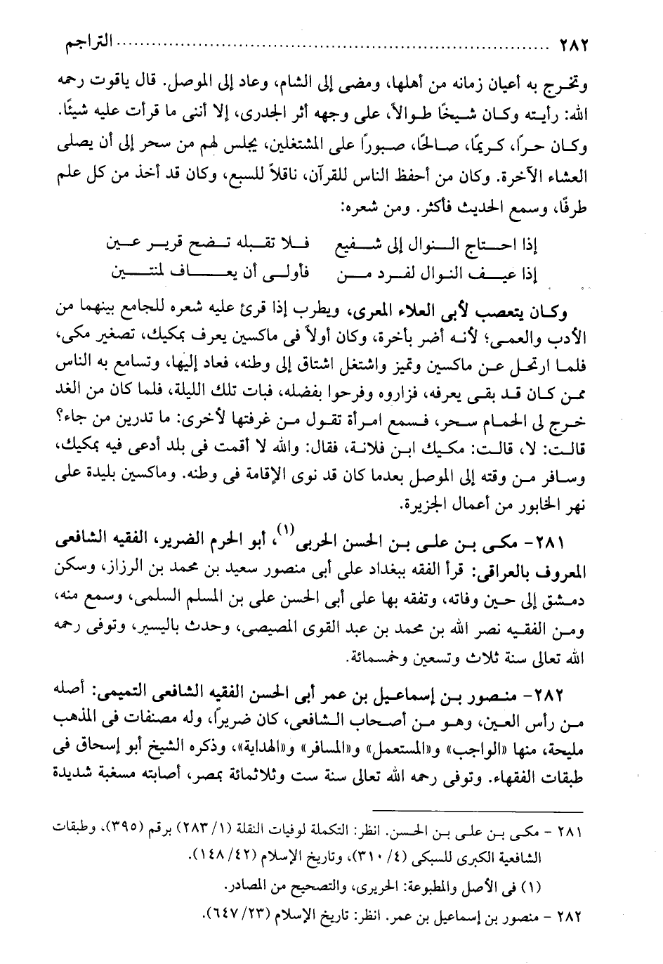 منصور بن إسماعيل: بن عمر أبي الحسن. الفقيه الشافعي التميمي. أصله من رأس العين. وهو من أصحاب الشافعي. كان ضريراً. وله مصنفات في المذهب، مليحة. منها: الواجب، والمستعمل، والمسافر، والهداية. وذكره الشيخ أبو إسحاق في طبقات الفقهاء. وتوفي رحمه الله تعالى سنة ست وثلاثمائة بمصر. أصابته مسغبة شديدة